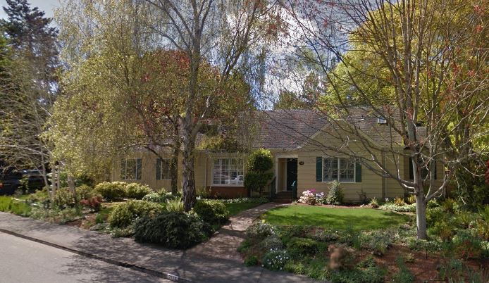 A one-story Colonial Revival house, built in 1942, with large picture windows and horizontal siding.
