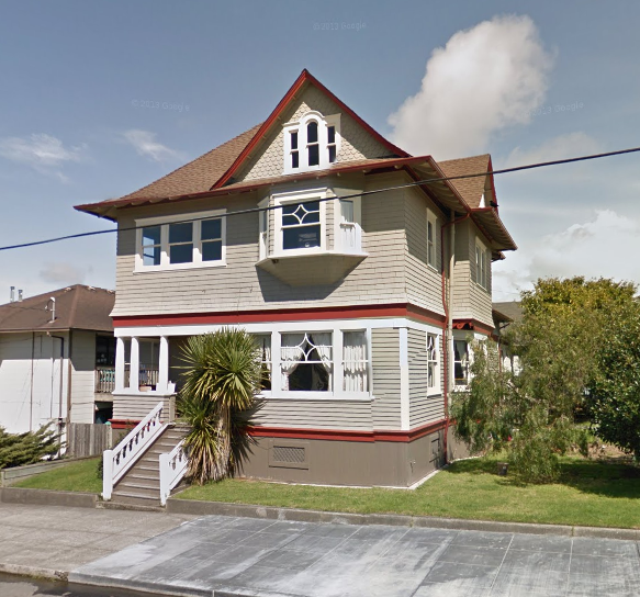 Built in 1906. This two story frame house features corner bays, Palladian windows (the roof where the Palladian window is located also has a small gable), a second-floor bay and an interesting recessed porch.