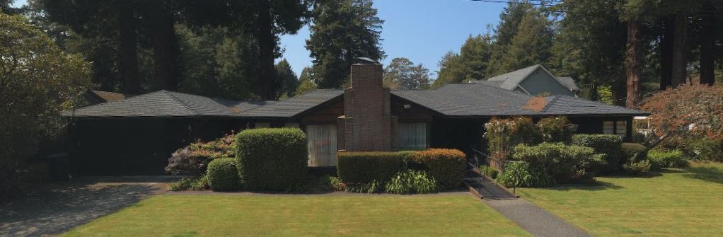 This is a one-story Ranch house built in 1950 with a large front facade and a stepped chimney flanked by expansive windows.