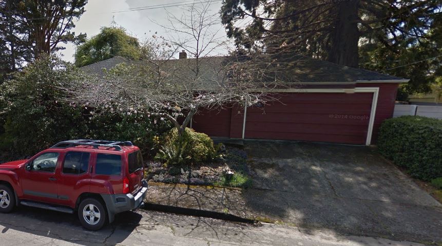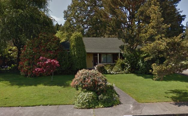 This is a one-story house with a low hipped roof and horizontal siding built by Ernest Pierson in 1946.