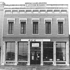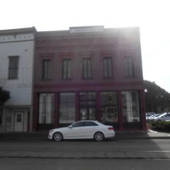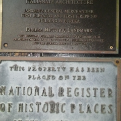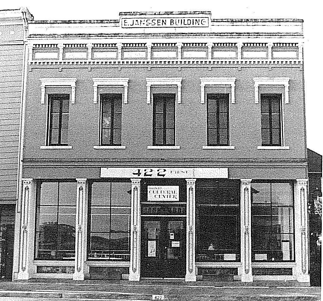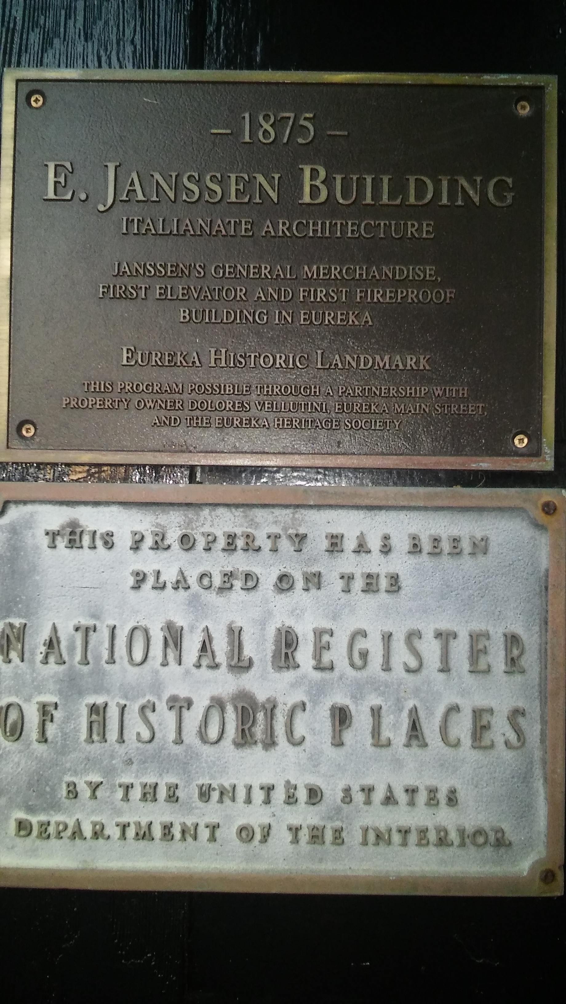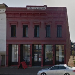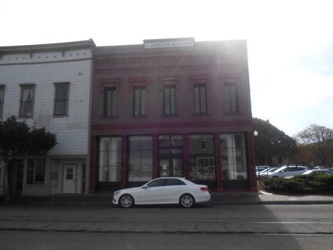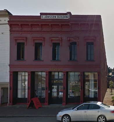 Built 1875. A nice red two-story brick Italianate building with cast iron pillars at the front with cast marks reading “City Iron Works, San Fransisco, 1875”. Sometime entire fronts of buildings were constructed of iron to combat the fires that occasionally ravaged cities in the 19th century. If you look carefully you can see where the iron shutters were attached in the alcoves. Corniced label moldings are located above each of the five second-floor windows. The cornice is not highly textured, but complements the window moldings. It was used as the hardware store of Captain H.H. Buhne (the first American over the Humboldt Bar into the Bay) for many years. Inside the building you can still observe the balcony that allowed the salesmen access to upper-level storage. Eureka’s first elevator was to the back of the building. Once used as the Humboldt Cultural Center, the building now houses the First Street Gallery and is listed on the National Register of Historic Places.