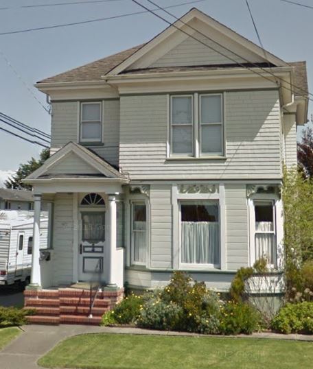 This two-story Queen Anne/Colonial revival was built in 1904 with a decorative bay and a classically inspired porch. Built by Hill and Acorn. Identical to 1407 and 1413 J St. Source: Eureka, An Architectural View.
