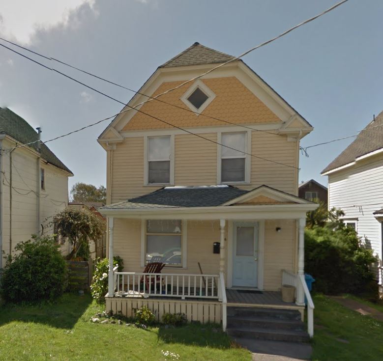 Built in 1904, this two-story frame house features a jerkin head roof and full-width front porch with pediment. The home was originally owned by J. Palmer and F. Van Zandt and was built by Van Zandt and Palmer. Source: Eureka, An Architectural View.