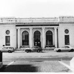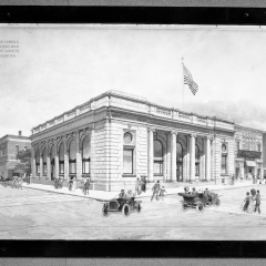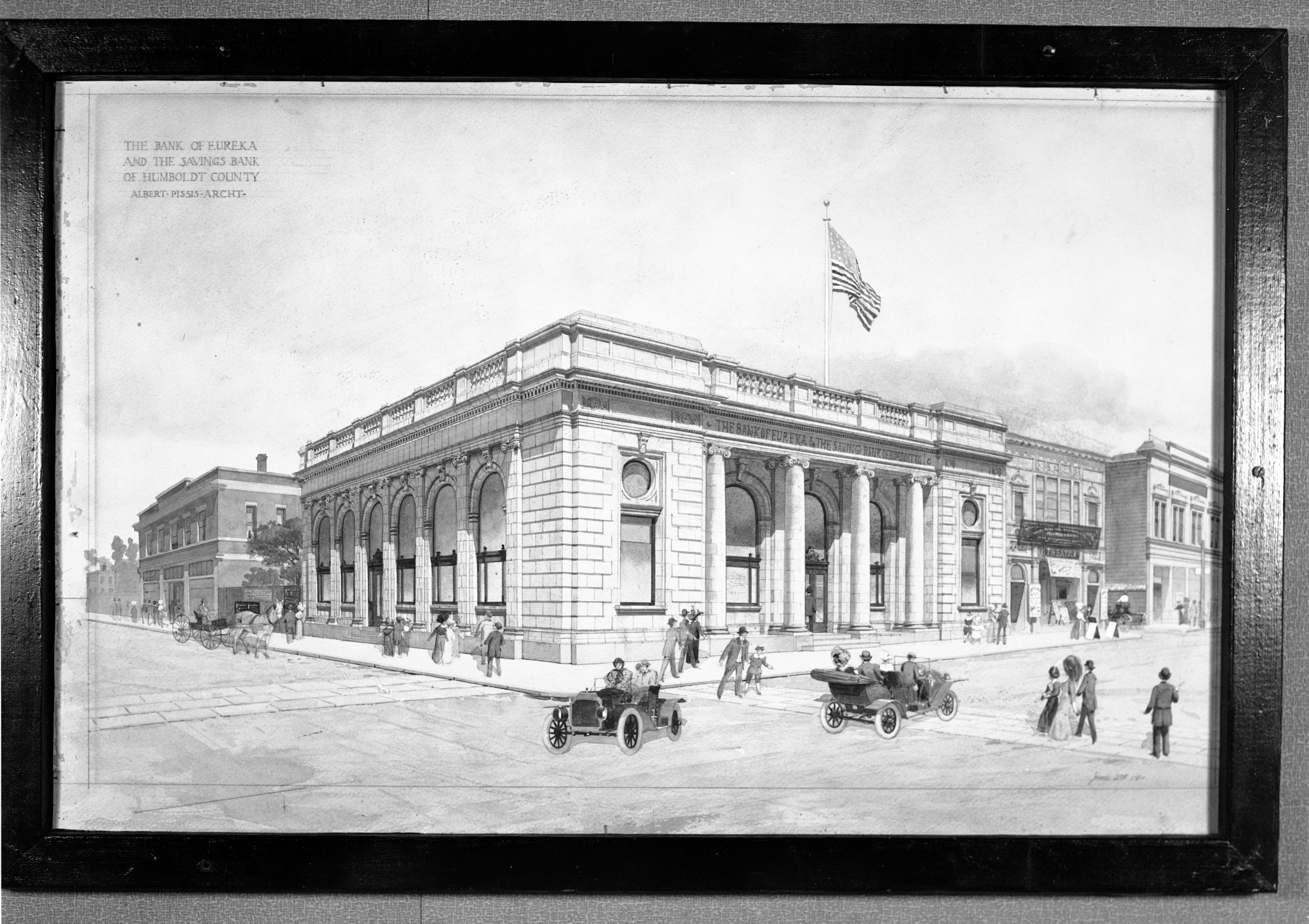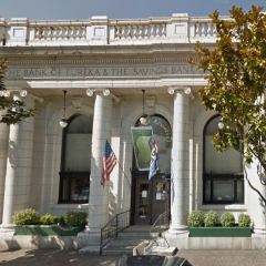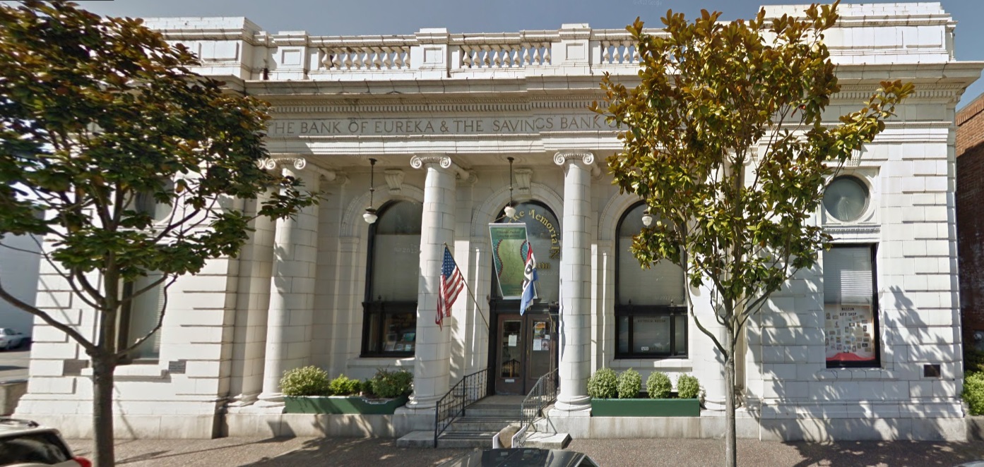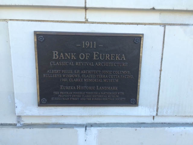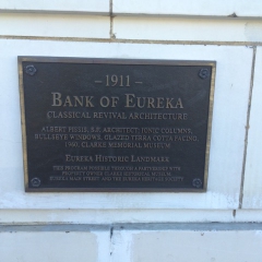 Built in 1911. This structure is listed on the National Register of Historic Places, used to be the site of the Bank of Eureka, and now houses the Clarke Historical Museum. This structure was designed by noted San Francisco architect Albert Pissis, a graduate of the Ecole des Beaux Arts in Paris. The bank building is a Classical Revival or Neoclassical structure, notable for the unusual exterior, which is covered in glazed architectural terra-cotta over brick. It is the most significant structure covered in this material north of San Francisco. Quoined pavilions flank the recessed portico supported by ionic columns and an extensive balustraded parapet appears above the cornice. Upon its completion in 1911, The Humboldt Times waxed enthusiastic over this building, claiming it to be “undoubtedly the most magnificent modern banking building to be found in all of Northern California.”