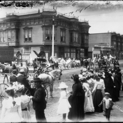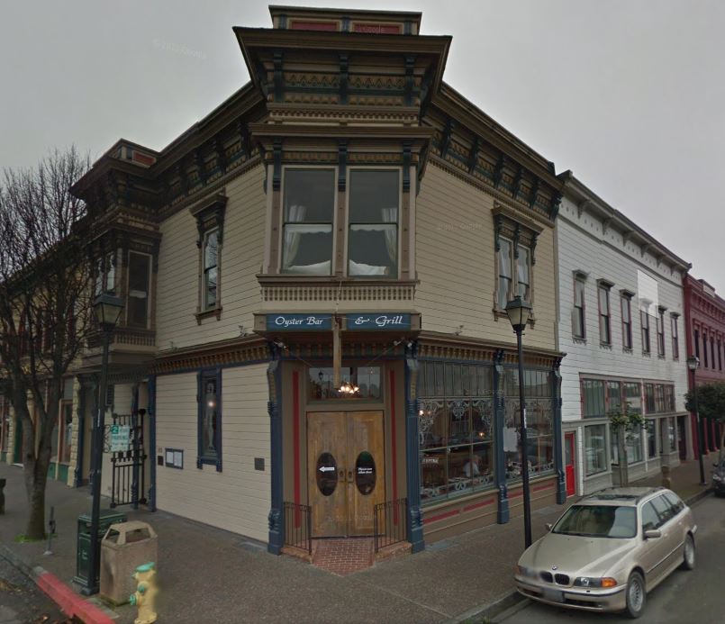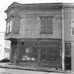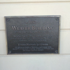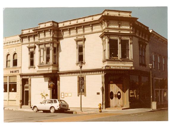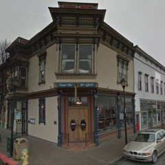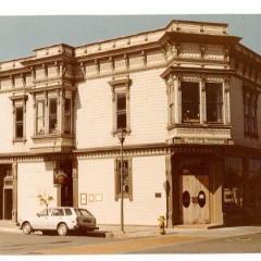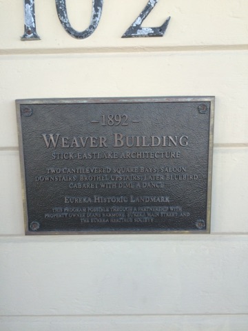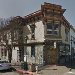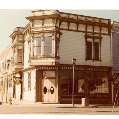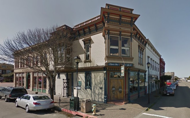 Built 1892. This two-story frame Stick/Eastlake commercial building was constructed entirely of local redwood and features a projecting second-floor corner and side bay windows. The brackets on the corner of the entry are reminiscent of the Carson Mansion. This site was originally constructed as The Humboldt House in 1853, a leading Eureka Hotel. After the Hotel fell into disrepair in the 1890’s it was demolished and the current structure was erected, this time as the Wave Saloon, a rowdy gathering place for loggers, sailors, and stevedores. The upstairs of the building was used as a house of prostitution at the time. In the 1920’s the Saloon became a bootlegging establishment, and was renamed the Golden State Cafe after Prohibition. After World War Two the building fell into disrepair and it wasn’t until 1973 that the structure was restored using Federal Urban Renewal funding. This property is on the National Register of Historic Places.