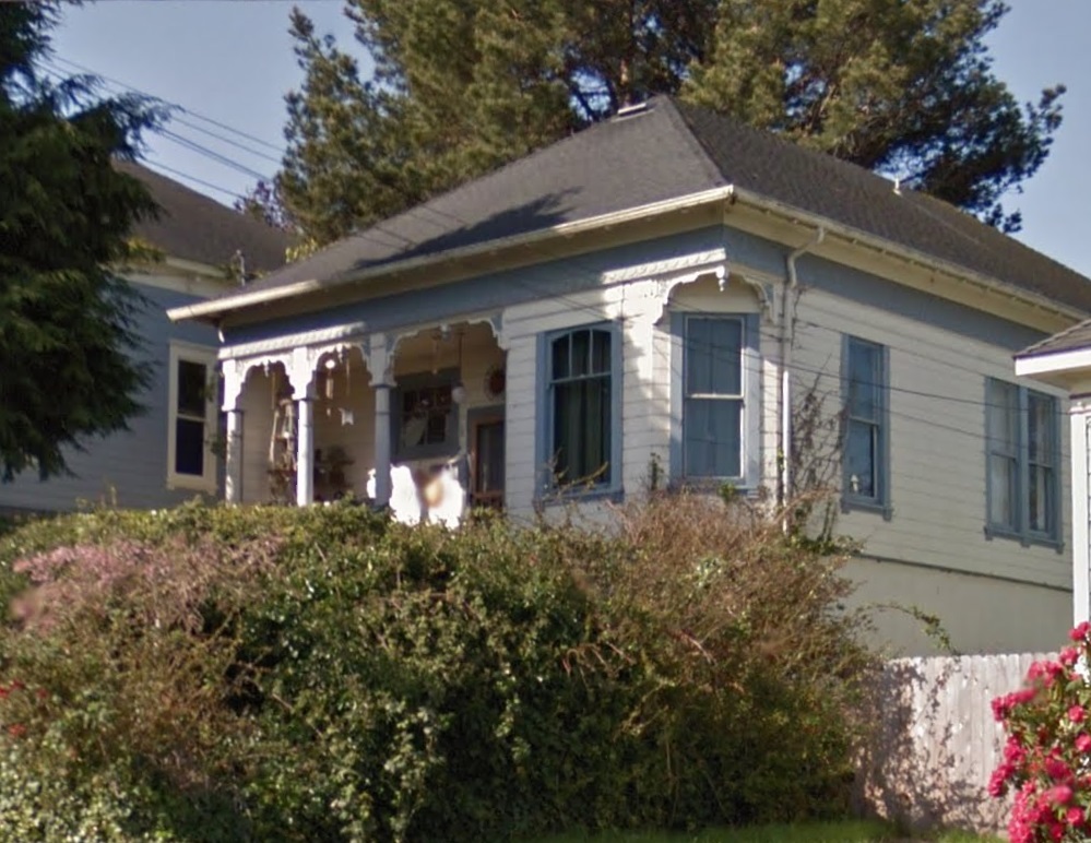 Built in 1909, this historic one-story frame cottage has a hipped roof with recessed porch and bay, as well as decorative column brackets. This is the second of thirteen similar homes. The original owner was C. Christopherson. Source: Eureka, An Architectural View.