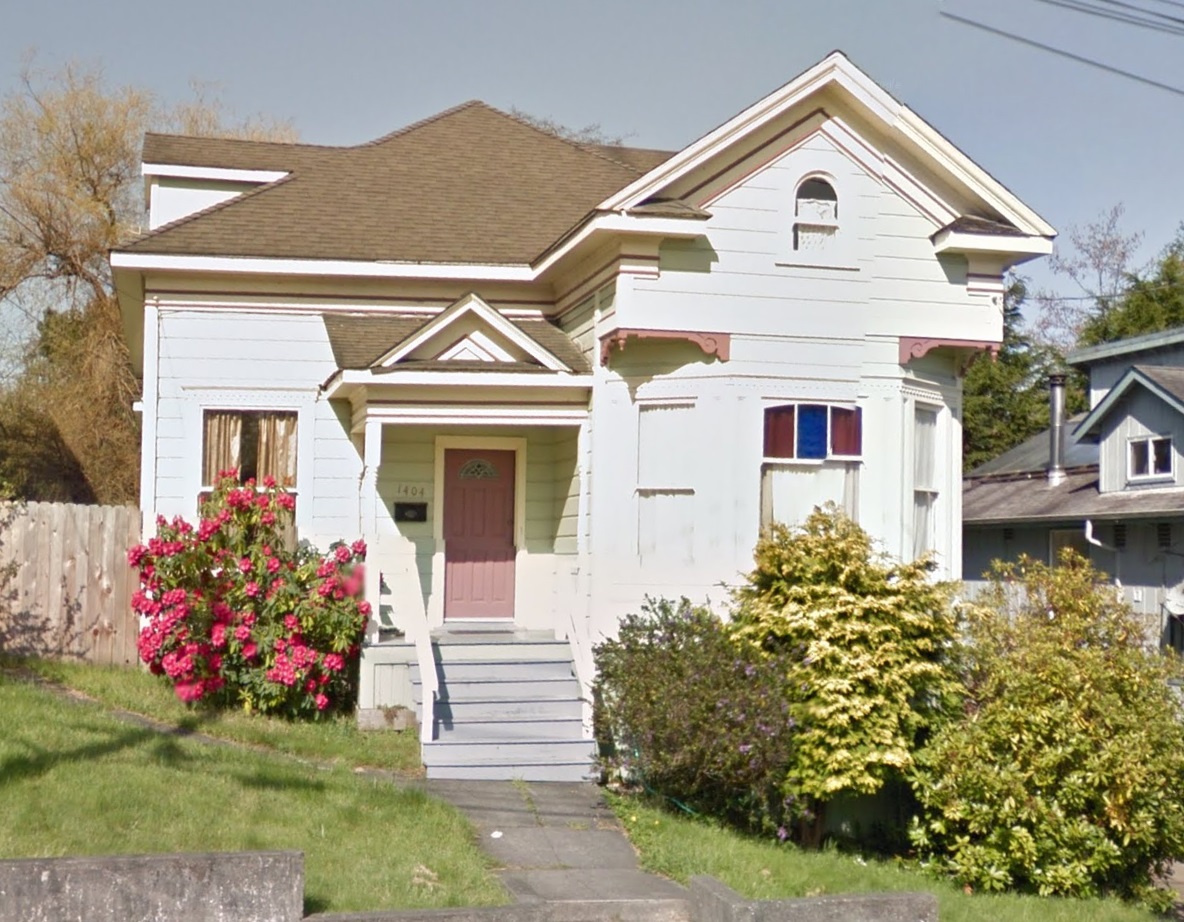 This one-story frame late Queen Anne house was built in 1906 and features a projecting pedimented bay and pedimented portico; it is one of thirteen similar homes. This property was originally owned by J. Olsen.