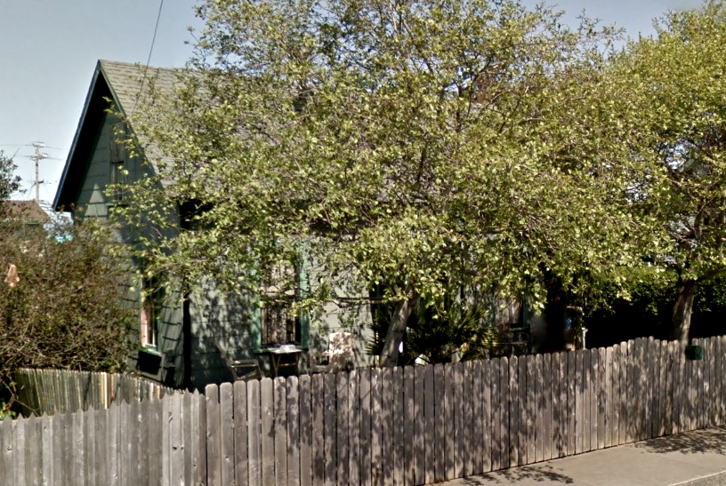 This is a one-and-a-half-story frame house with gabled roof and pedimented central portico. It was built ca. 1900. The front view is obscured by landscaping.