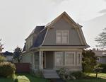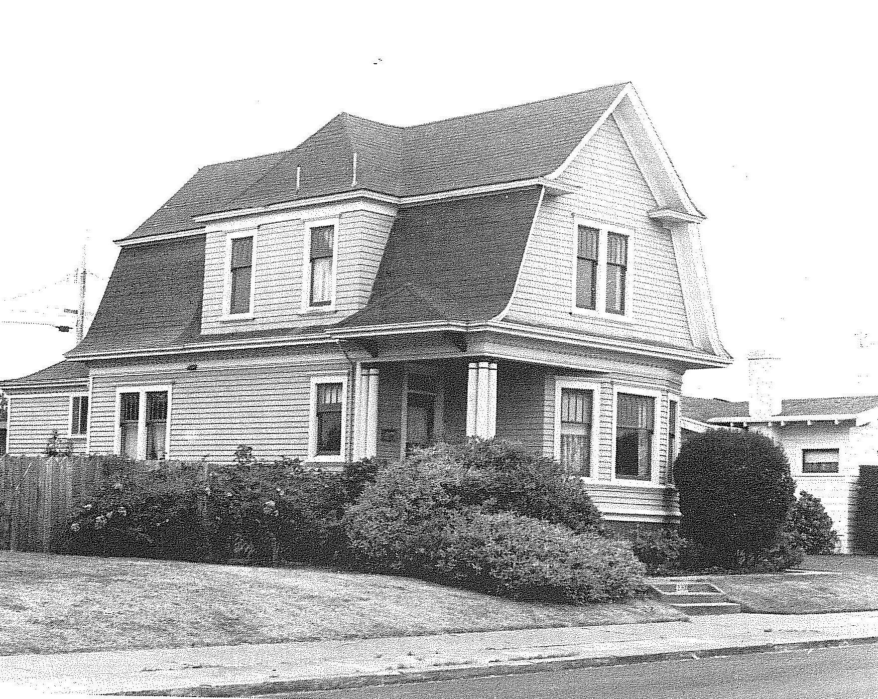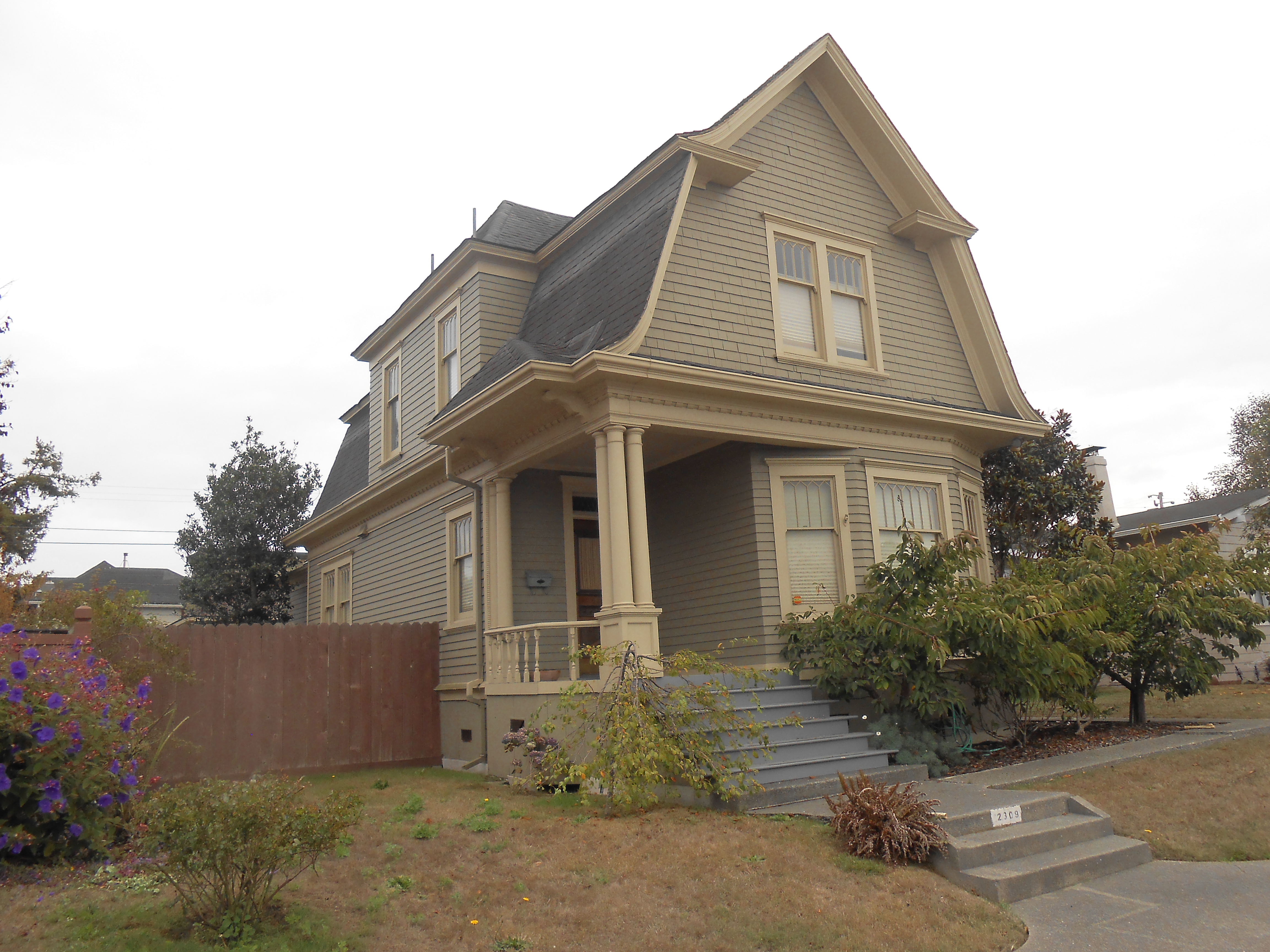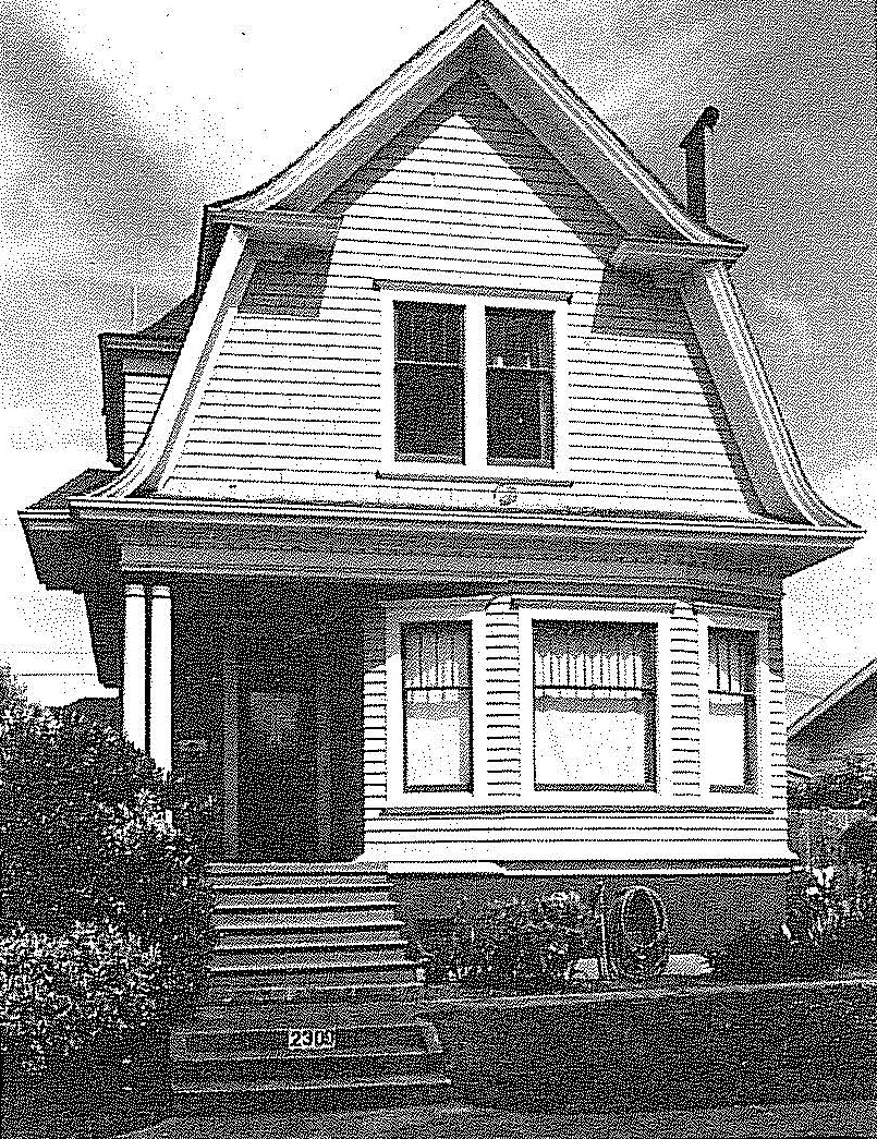 Built 1905. This house boasts a colonial revival porch and segmented windows, which make it a late Queen Anne. The roof style is called a gambrel, and although it is most often associated with barns it also serves the purpose of providing more space on the upper floor, which is also its purpose in this structure.