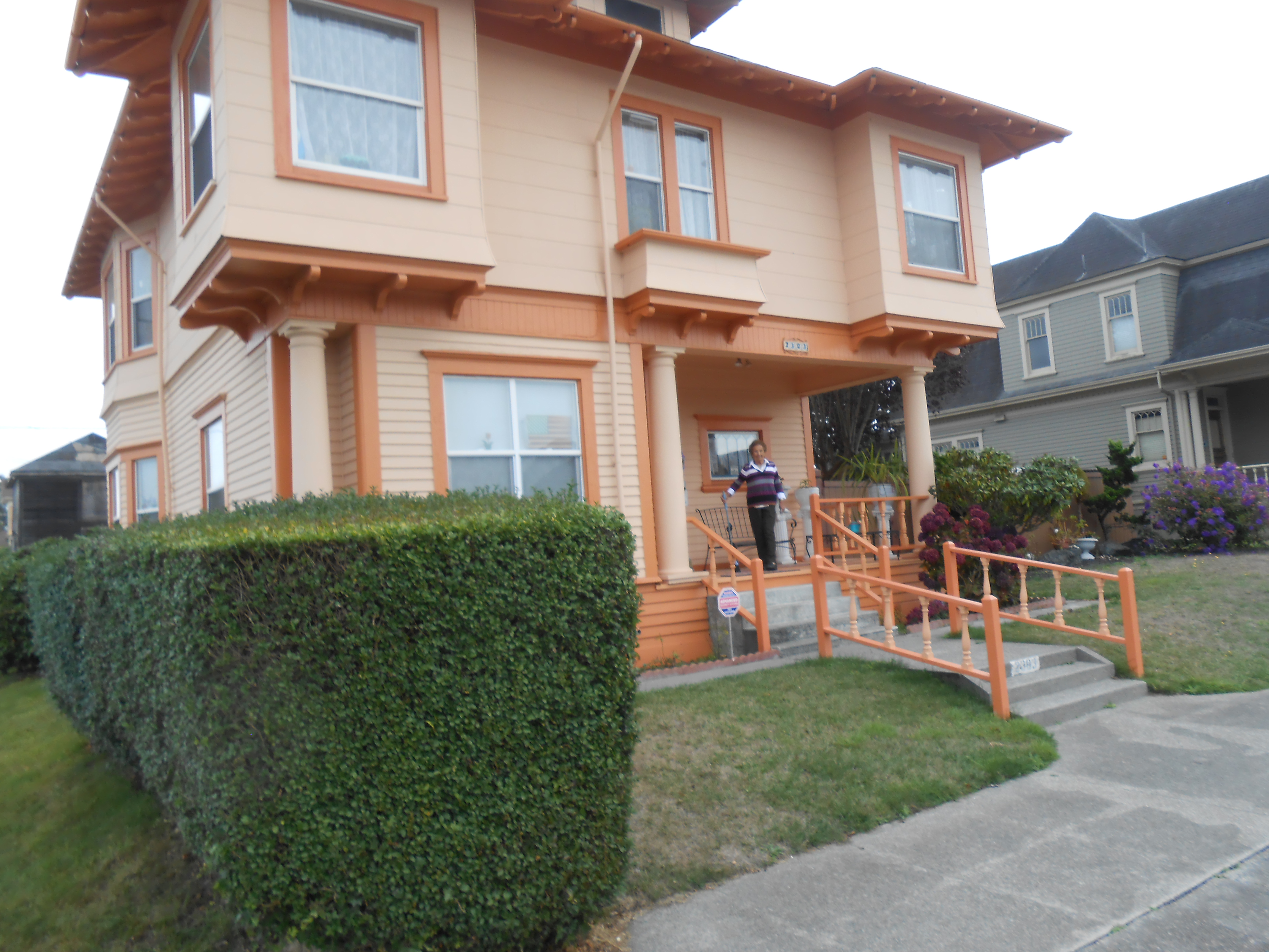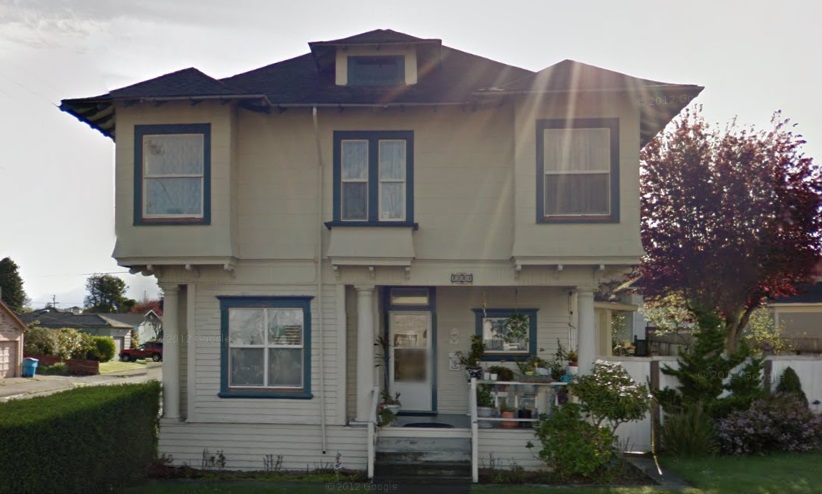 This large gray house has a very attractive colonial revival porch. The pillar theme is even repeated at the corner of the house.