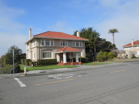 Built 1912 by D.P. Simpson. This two-story Mission/Mediterranean house is very similar in style and size to its neighbor, 2204. Though simple, both have the requisite stucco and tile roofs to be classified as Mission. Large square piers support the hipped tile porch roof, which leads to the oak and beveled glass front entrance. Windows are generally single pane, and the large front windows on the lower floor are set into arched reveals.