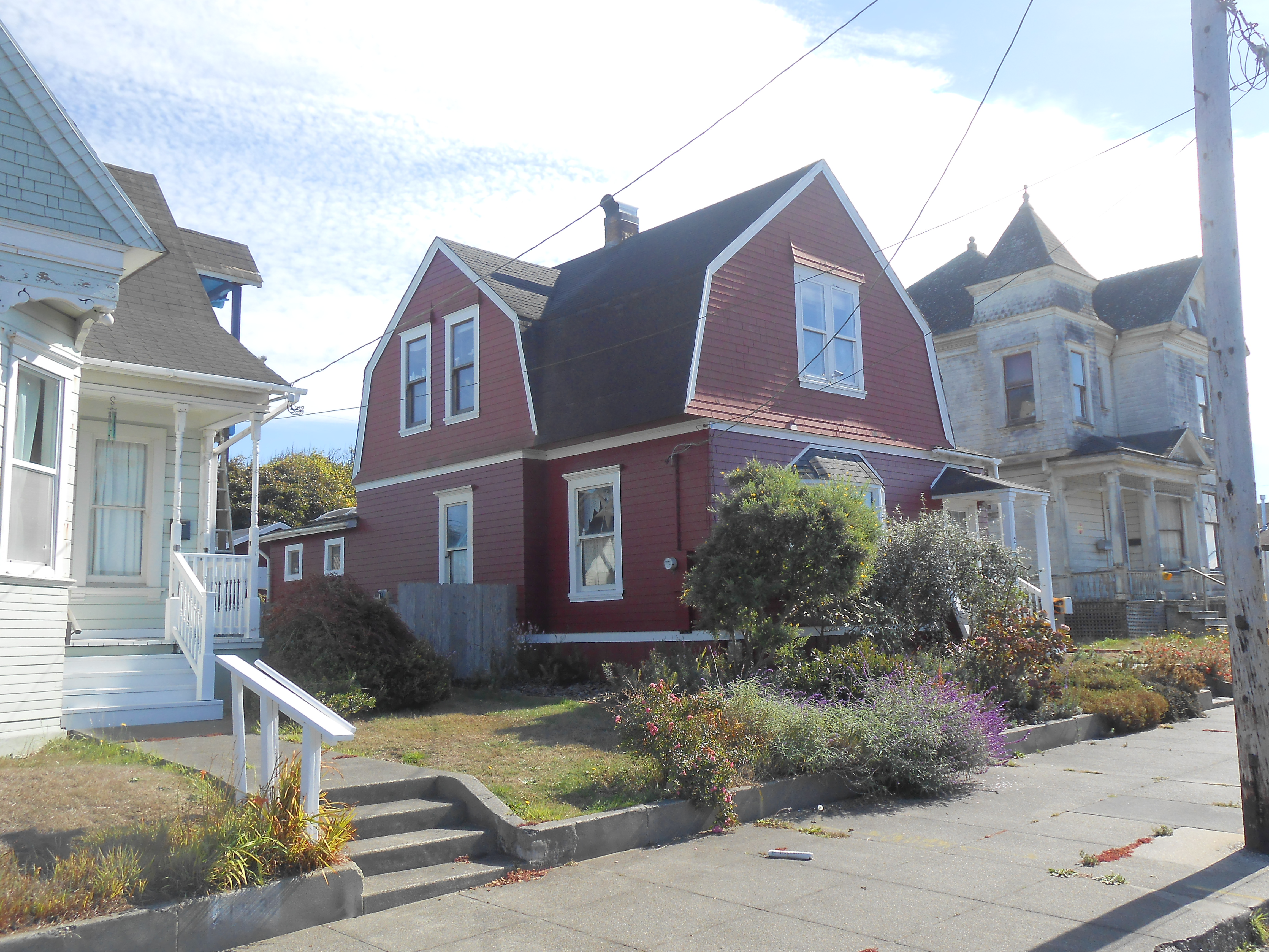 Built in 1902 by F. Row; two-story shingled Dutch Colonial Revival house with gambrel roof. (Eureka: An Architectural View)