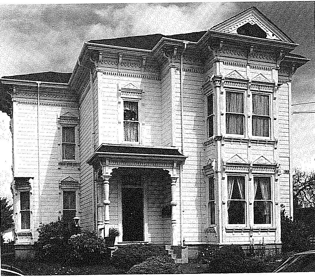 The ca. 1885 Fink House has Eastlake details that dominate the Stick style massing. The typical stepped massing emphasizes the prominence of the pedimented square bay. Dense dentil patterns and pendant decoration are favored on the elevations. Sun-burst designs within triangular frames are found above the window heads, and bracket moldings appear at regular intervals. (Green Book)