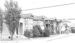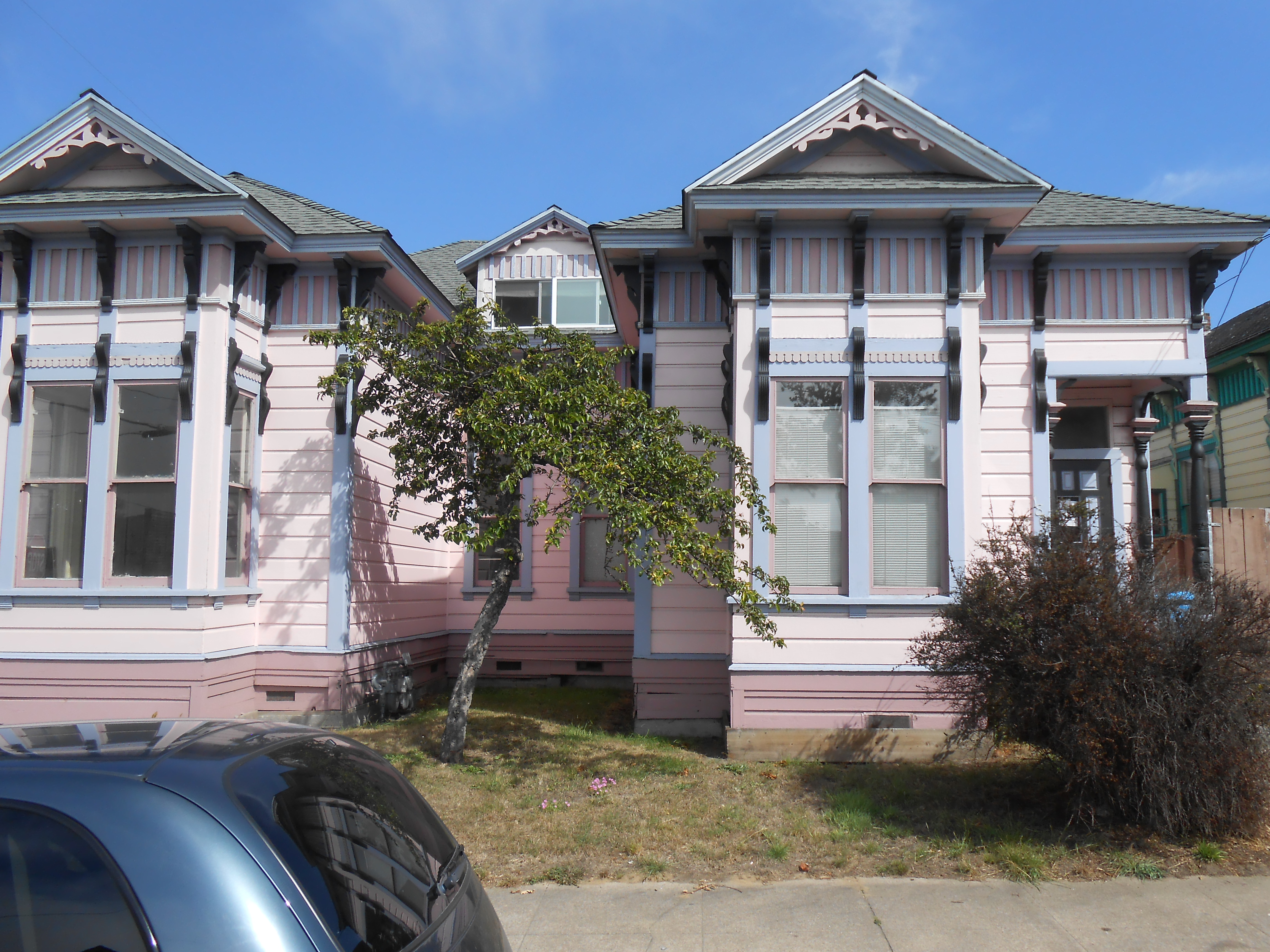 Built in 1889. These are an interesting set of Stick/Eastlake duplexes built in Fairhaven across the bay and reassembled here in town. A similar set sits next to the property. These duplexes are familiarized through its use of bright colors, gabled bays and roofs, and the use of black brackets the pop out against the vibrant colors. Built by Mowry and Foster. Owned by J. Willey.