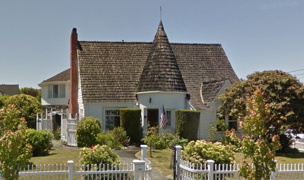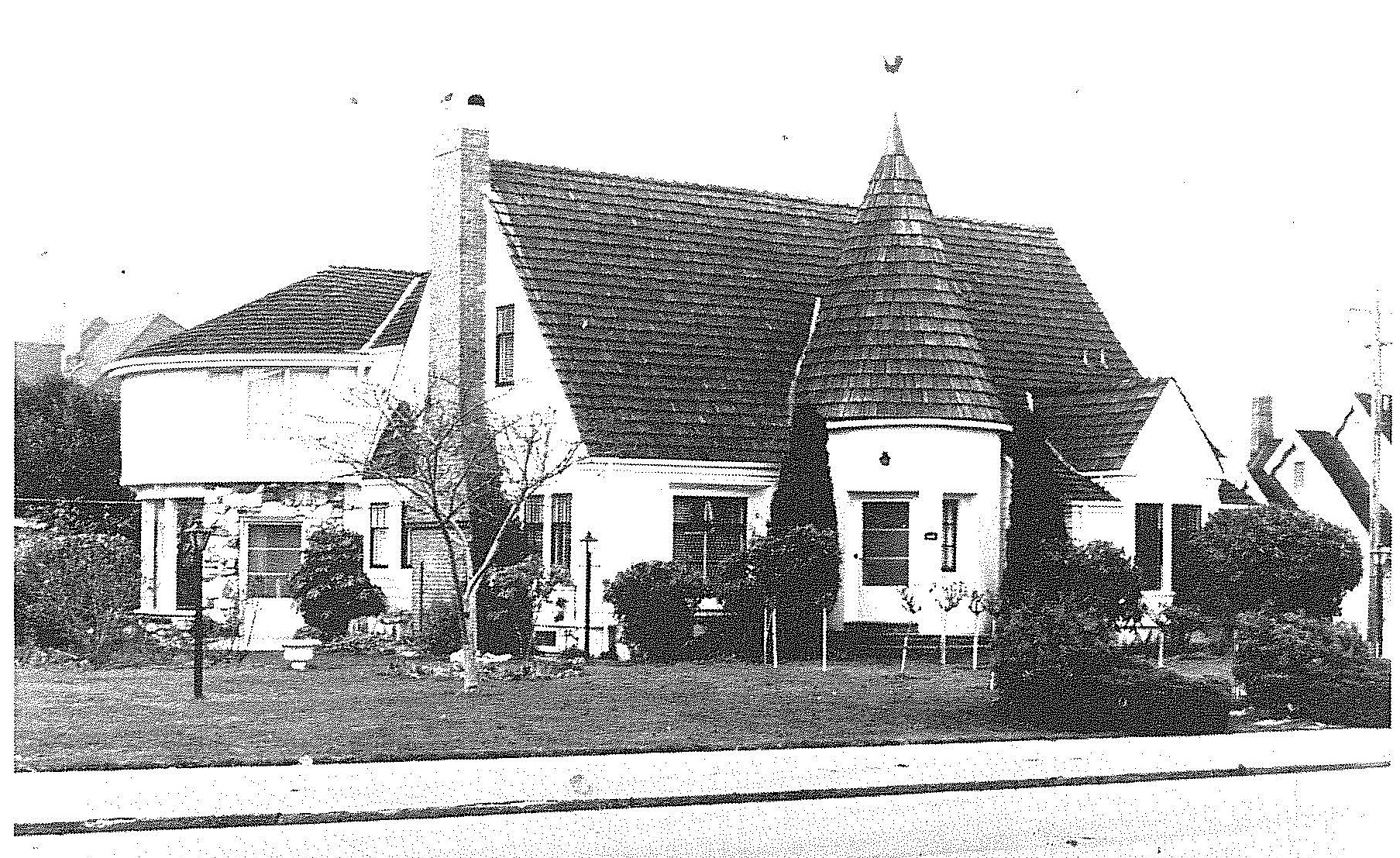 Built 1936. Prominently sited, this two-story home melds several styles into an unusual and charming home. Dominated by the characteristic tower with concial roof, the overall effect is very picturesque. The structure suggests Tudor, French farmhouse, and Norman Revival.