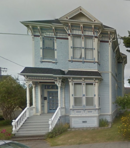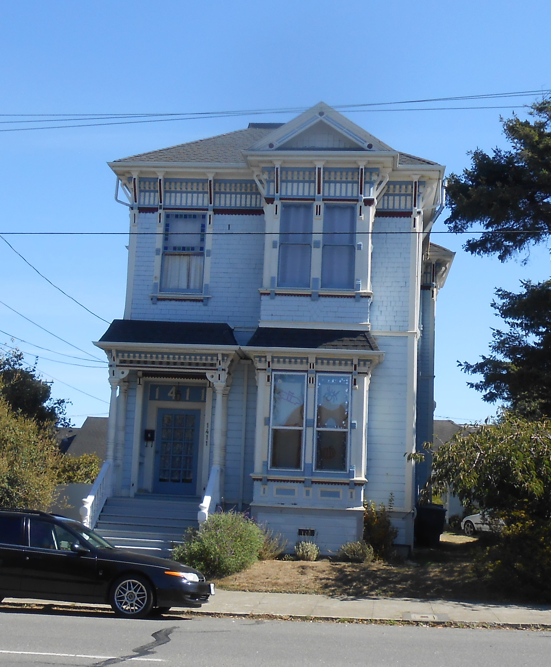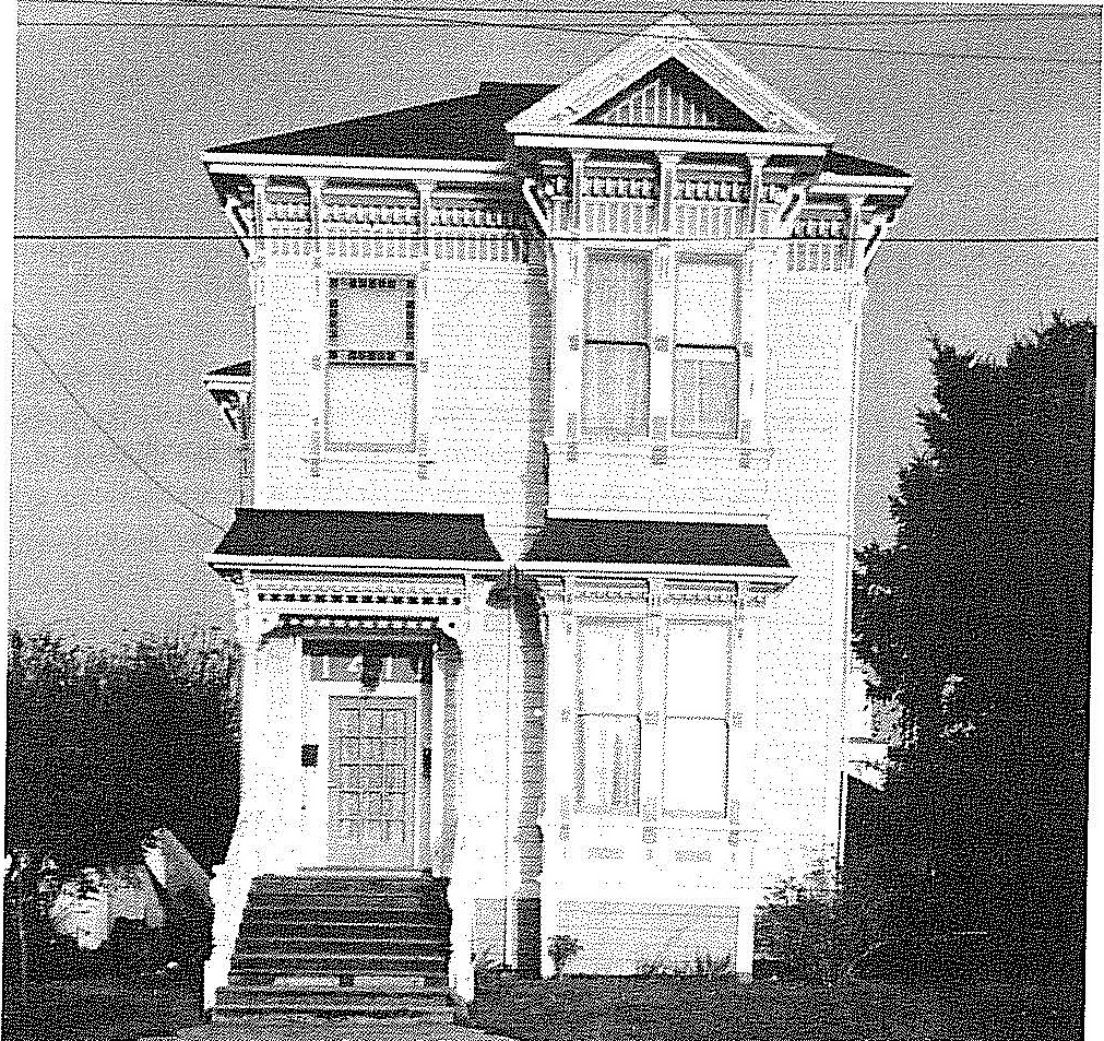 Built in 1890 by Thomas Johnson, this two-story Stick/Eastlake house has narrow proportions that are accentuated by a pedimented square bay. Also noteworthy is the attenuated frieze, further accented by narrow panels, dentils, and brackets. The Eastlake porch has a modified hipped roof which is echoed in the adjacent bay. (Green Book)