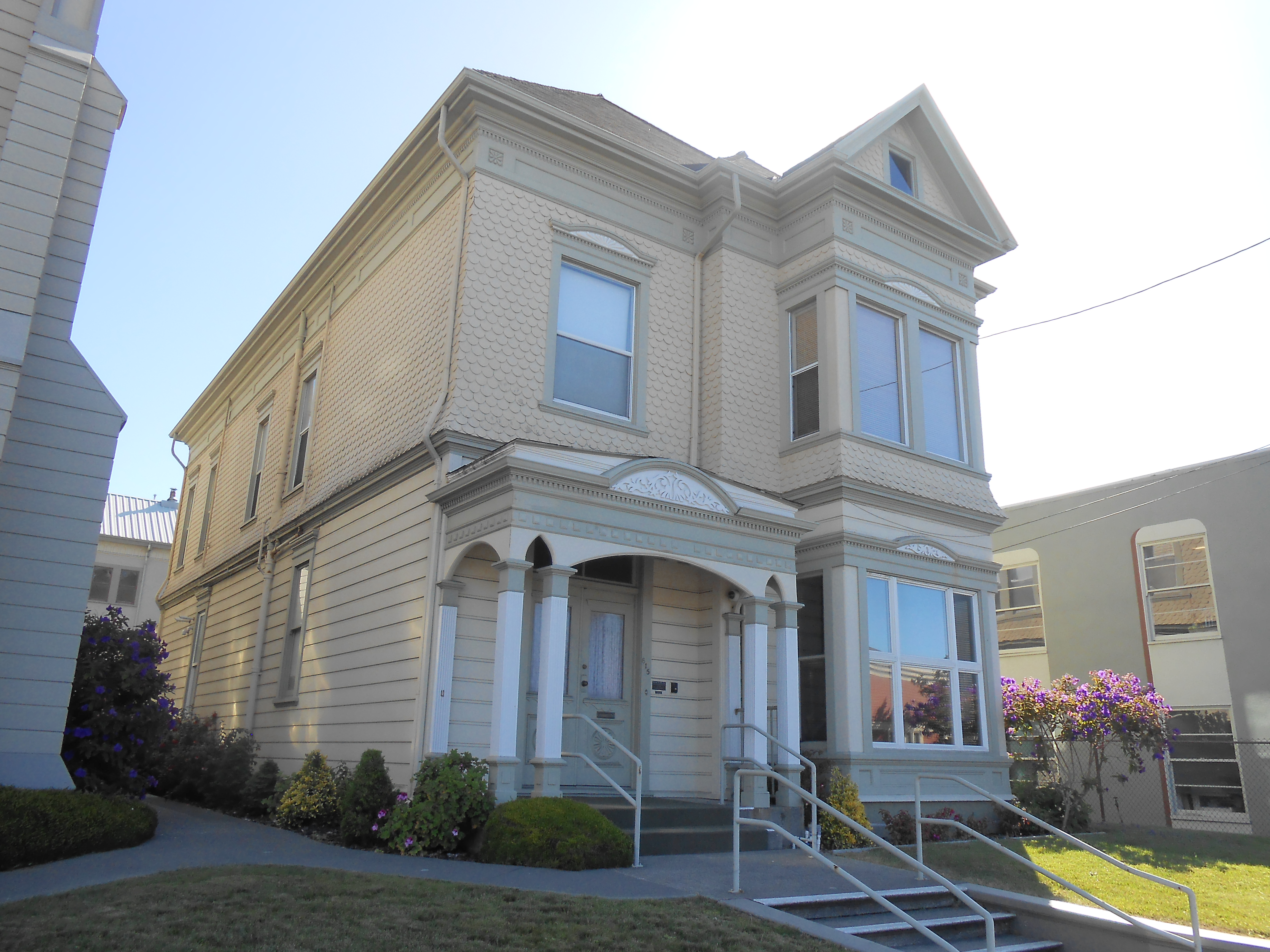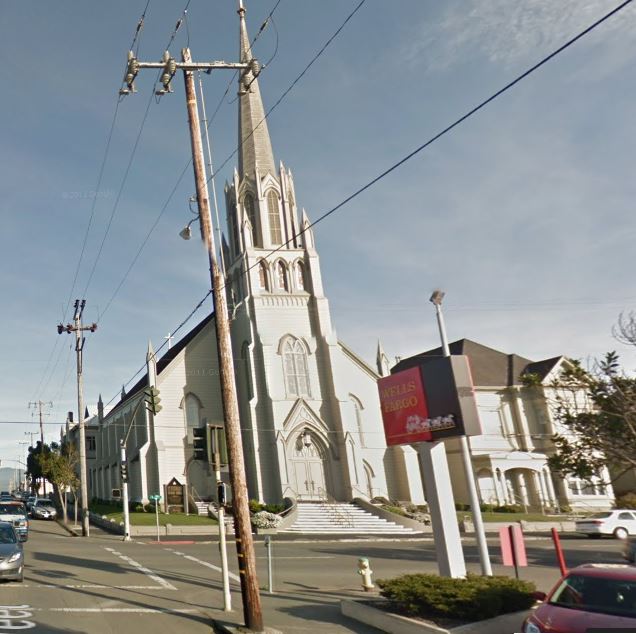 Built in 1885, the St. Bernard’s Catholic Church is a Victorian Gothic Revival with gothic, pointed-top windows and wooden buttresses that appear to support the walls. The house next door to the church is the St. Bernard’s Church Rectory. This two-story house is a shingle and frame Queen Anne house. Both were built by James Simpson.