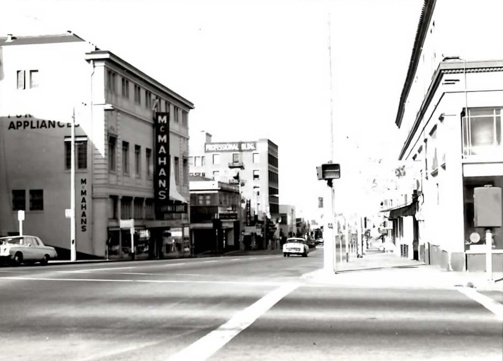 These photos show the architectural evolution of Fifth street looking West from the intersection at H Street. In the foreground, McMahan’s, once a tenant of the Eureka Masonic Building, has since been replaced by Vern’s a local furniture company. Note the continuing presence of Eureka’s Professional Building.