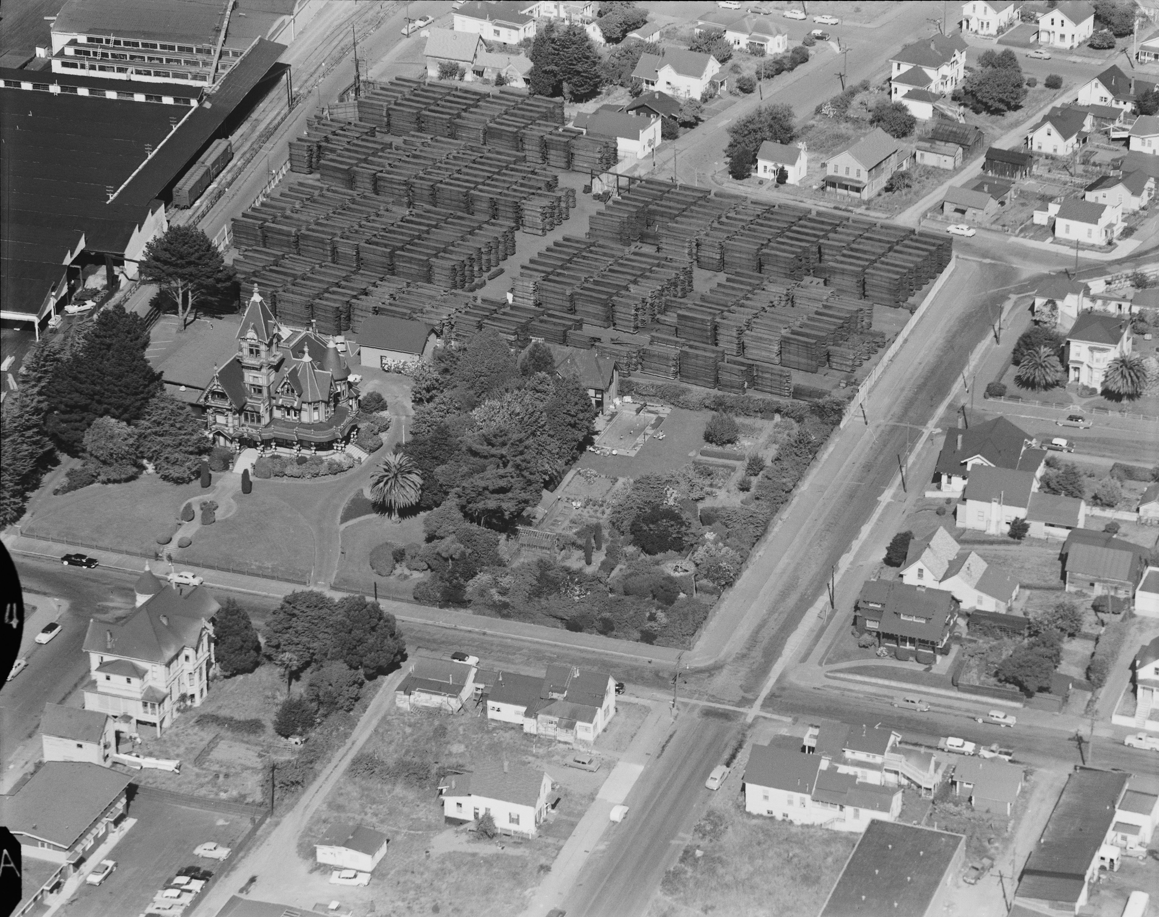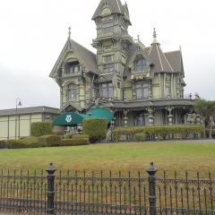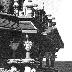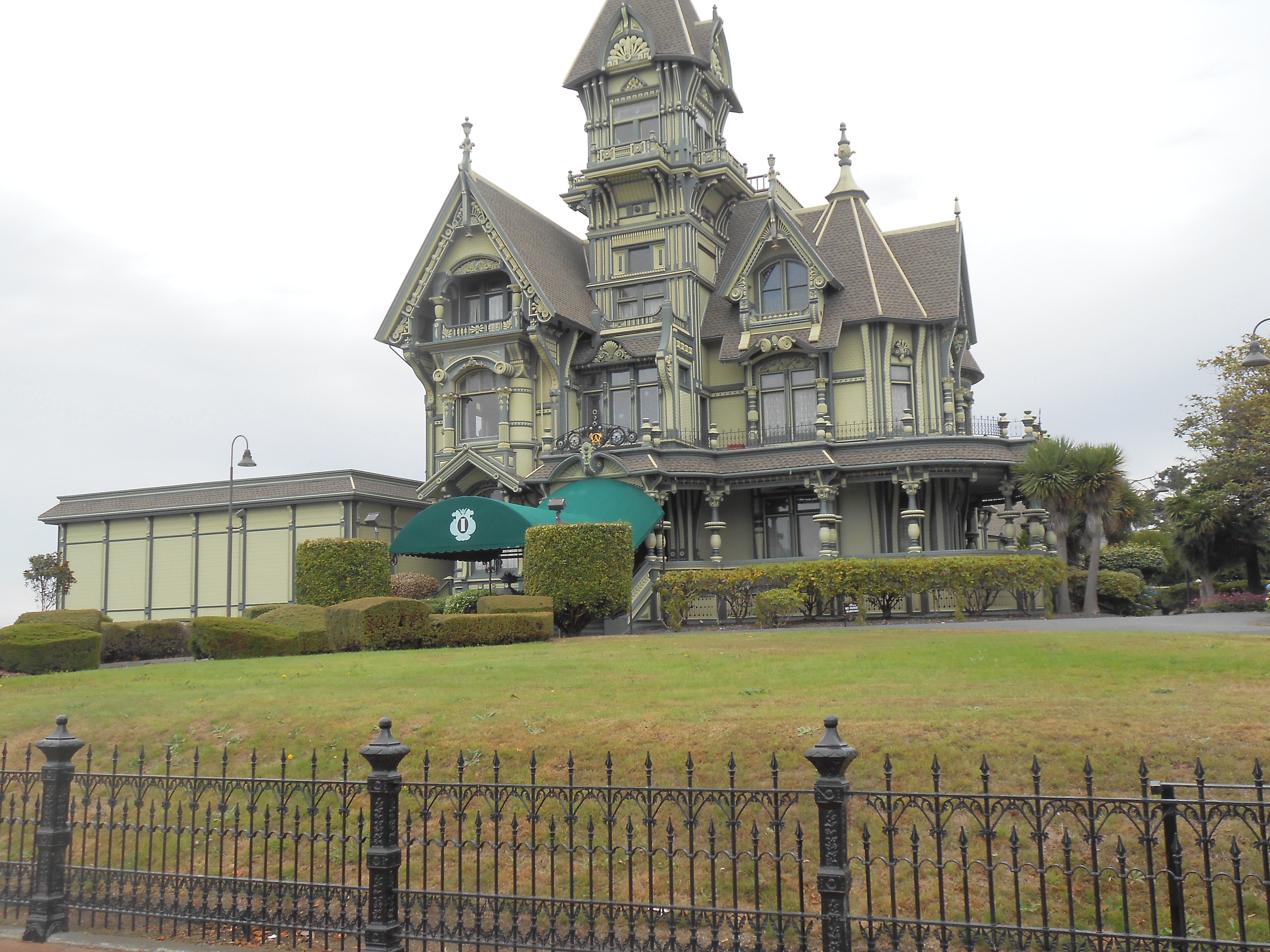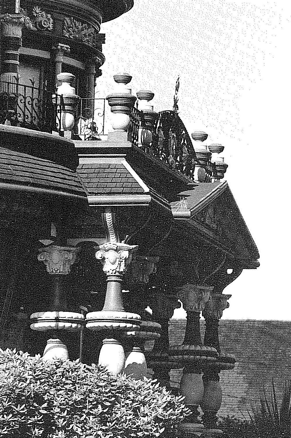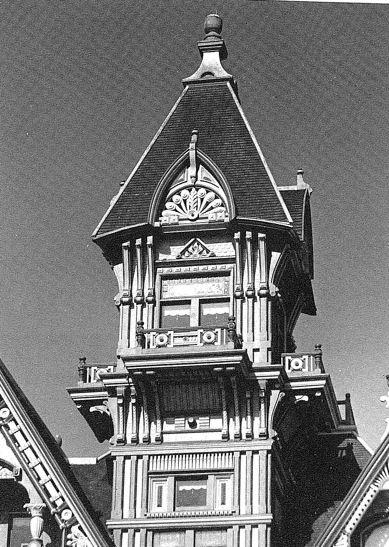 Prominently sited overlooking the bay and Carson’s historic mill site, the extensive grounds provide a pedestal for the structure. Eye-catching and shadow=producing surfaces showcase the use of wood-this three dimensional “pattern book” took one hundred men over two years to construct. Its influence on the design of subsequent buildings in Eureka is readily apparent even today. In addition to the abundant use of the redwood, Carson imported 97,000 feet of primavera (also known as “white mahogany”) from Central America, along with other woods from the Philippines, India, and Mexico. The elaborate interiors include exported stained glass, plaster work, and carved ornament in exotic woods.