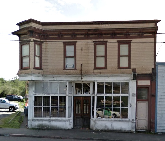 This is a two-story frame commercial building with second-floor projecting corner bay and glazed store fronts. It was built in 1905. There have been a series of businesses in this building. It is now a “Healing Center.”