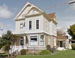 This well-kept two-and-a-half story Eastlake home also boasts an angled bay on the lower story, nice dentil work in the gable. Especially interesting features are the remaining hitching post for horses and carriage step on the sidewalk. If you look closely, you can read the word “Thomson” on the carriage post, which reflects the name of a historic owner of the home. It’s an interesting reminder of the per-automobile age and adds to the many carriage houses in town.