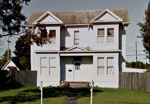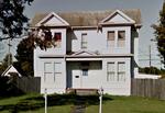 This is a two-story frame symmetrical house with gabled roof, central pedimented entry, and flanking two-story pedimented square bays decorated with rows of recessed panels. It was built in 1885. The original owner of record was J.Hill.