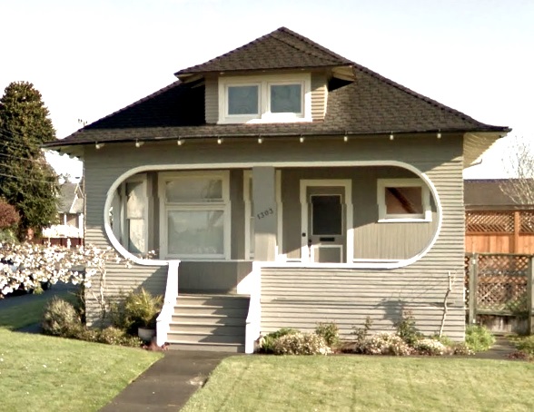This is a one-story frame house with hipped roof, central dormer, and circular and semicircular cut-outs in walls that form the porch. It was built in 1906. The original owner of record was W.Ward.