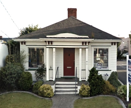 This is a 1925 one-story frame symmetrical cottage with hipped roof, overscale portico with three square columns at each corner, and curved parapet. The original owner of record was A.Adams.