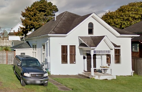This is a one-and-a-half-story frame symmetrical house with hipped roof, center gable and entry, spindlework, and paired windows. It was built ca. 1906. The original owner and builder was P. Peterson. It appears that there are some additions in the rear.