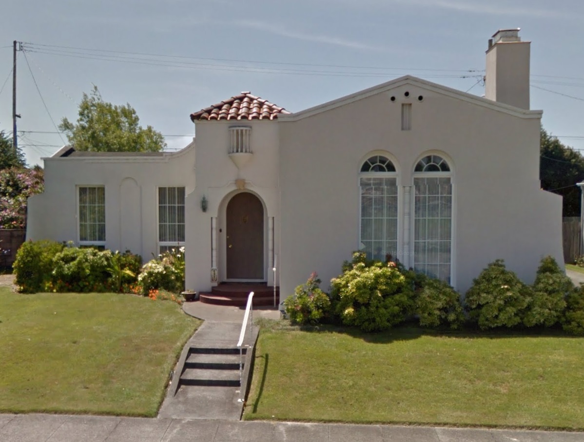 This one-story stucco Spanish Colonial Revival home was built in 1925 by McMath and Kinney and originally owned by C. Burke.The Spanish Colonial Revival style can be distinguished from the earlier Mission Revival style by it’s use of more red tile and much greater ornamentation. This home for instance features a tower at the entrance framed by a red tile roof. The stucco walls also often feature a variety of textures. (Source: Eureka: A Guide to the Architecture and Landscape, and Eureka: An Architectural View)