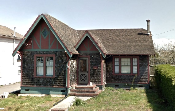 This is a one-story Tudor Revival house with half-timbering and stucco gable ends and multipaned upper sash windows. It was built in 1925.