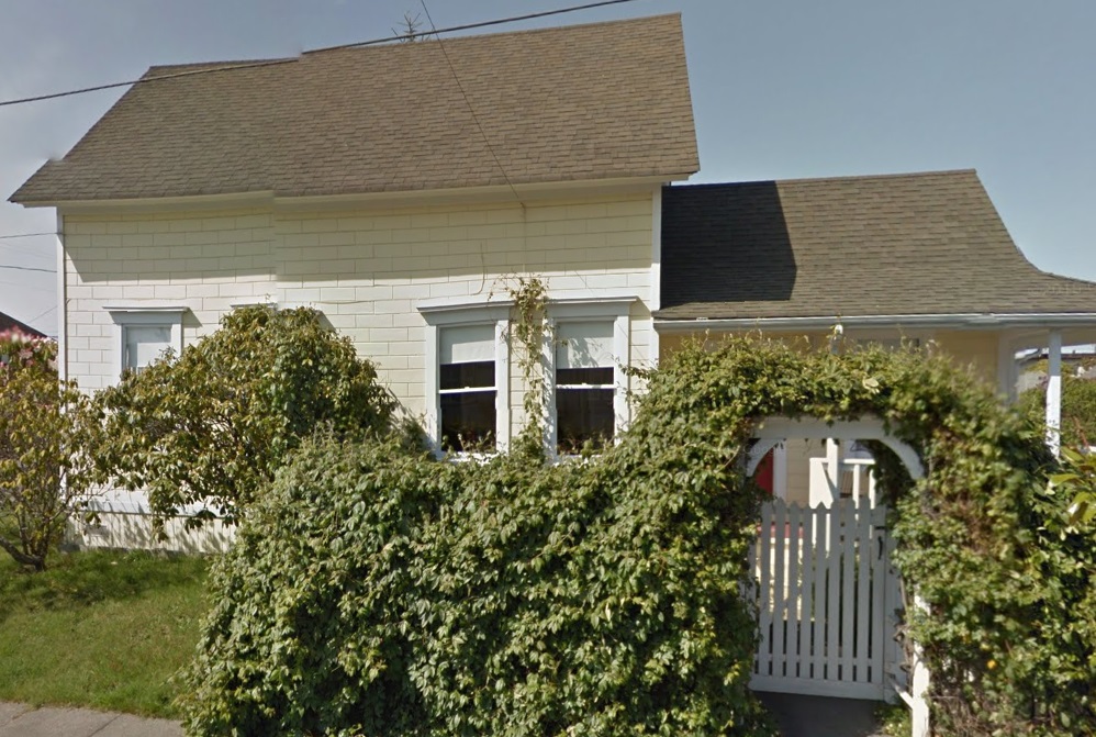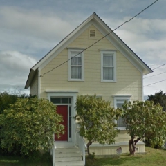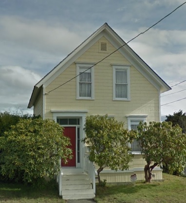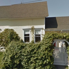 Originally built in 1870, this one-and-a-half story frame house with gabled roof features wood siding scored to look like stone. Additions have been made to the house, but please see second picture for closer detail of side scoring.