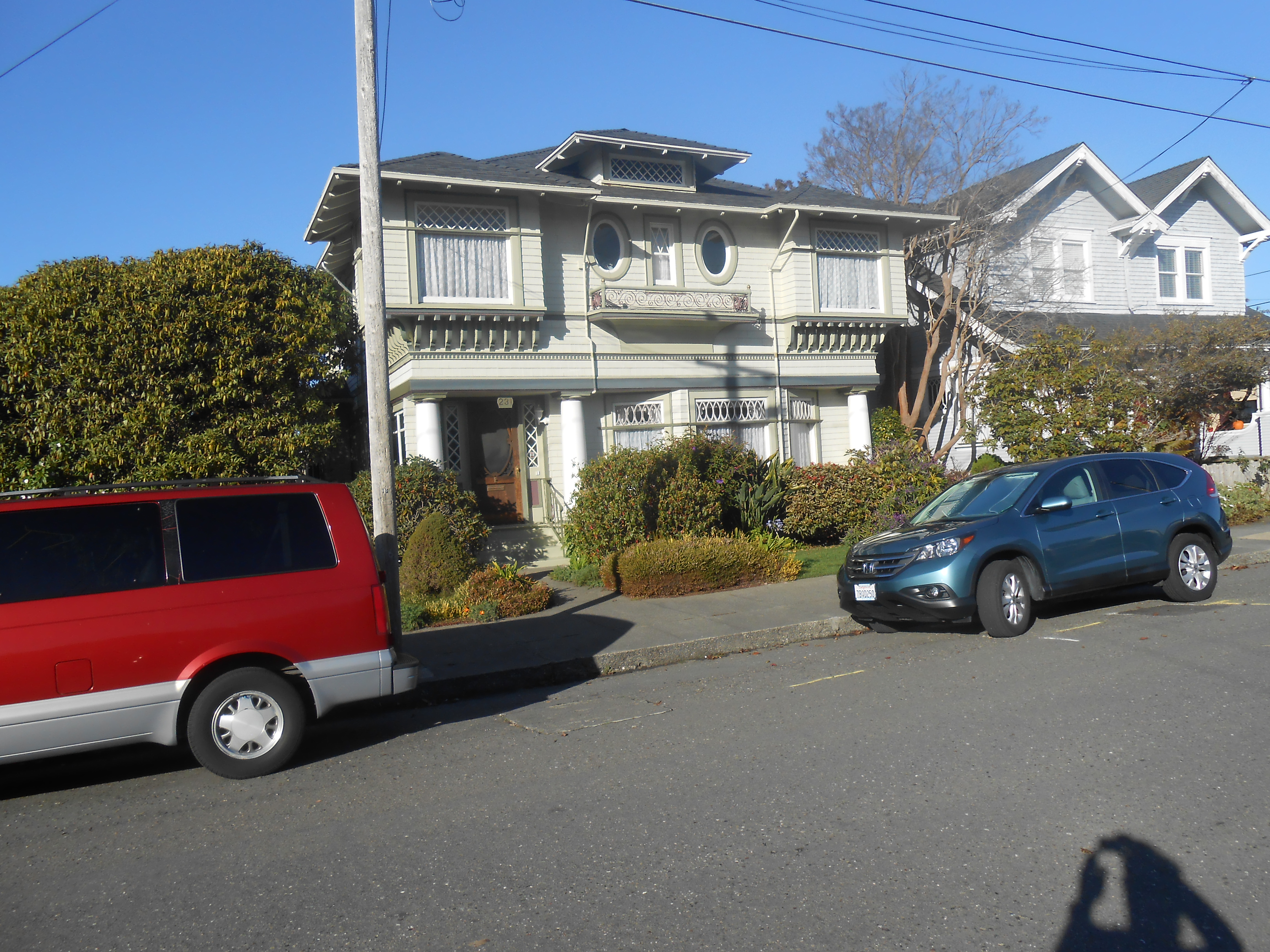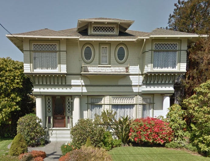 Built 1907 by C. Author. This two-story Colonial Revival/Craftsman boasts Colonial Revival details that add visual texture to this two-and-a-half-story Craftsman house designed for Frank Brown. Cantilevered corner bays on the upper floor seem to be supported by numerous curved brackets. Between these bays, a balconette appears below two large oval windows. Large Doric columns and a slanted bay are found on the main floor.