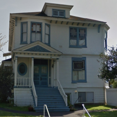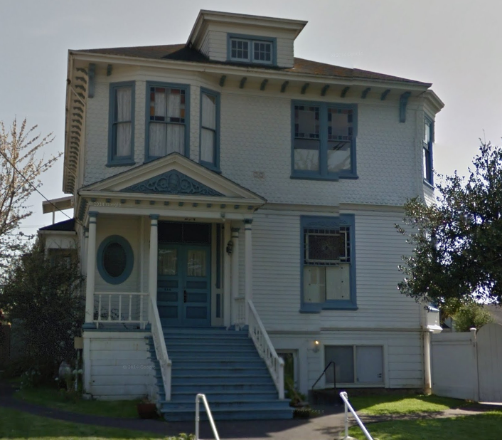 Built by Ambrose Foster and I. N. Thompson in 1898 and originally owned by W. Jones. This is a two-story shingled Queen Anne house. It has a hipped roof, side bay, pedimented portico and art glass windows. The frieze above the portico also has an intricate design.