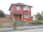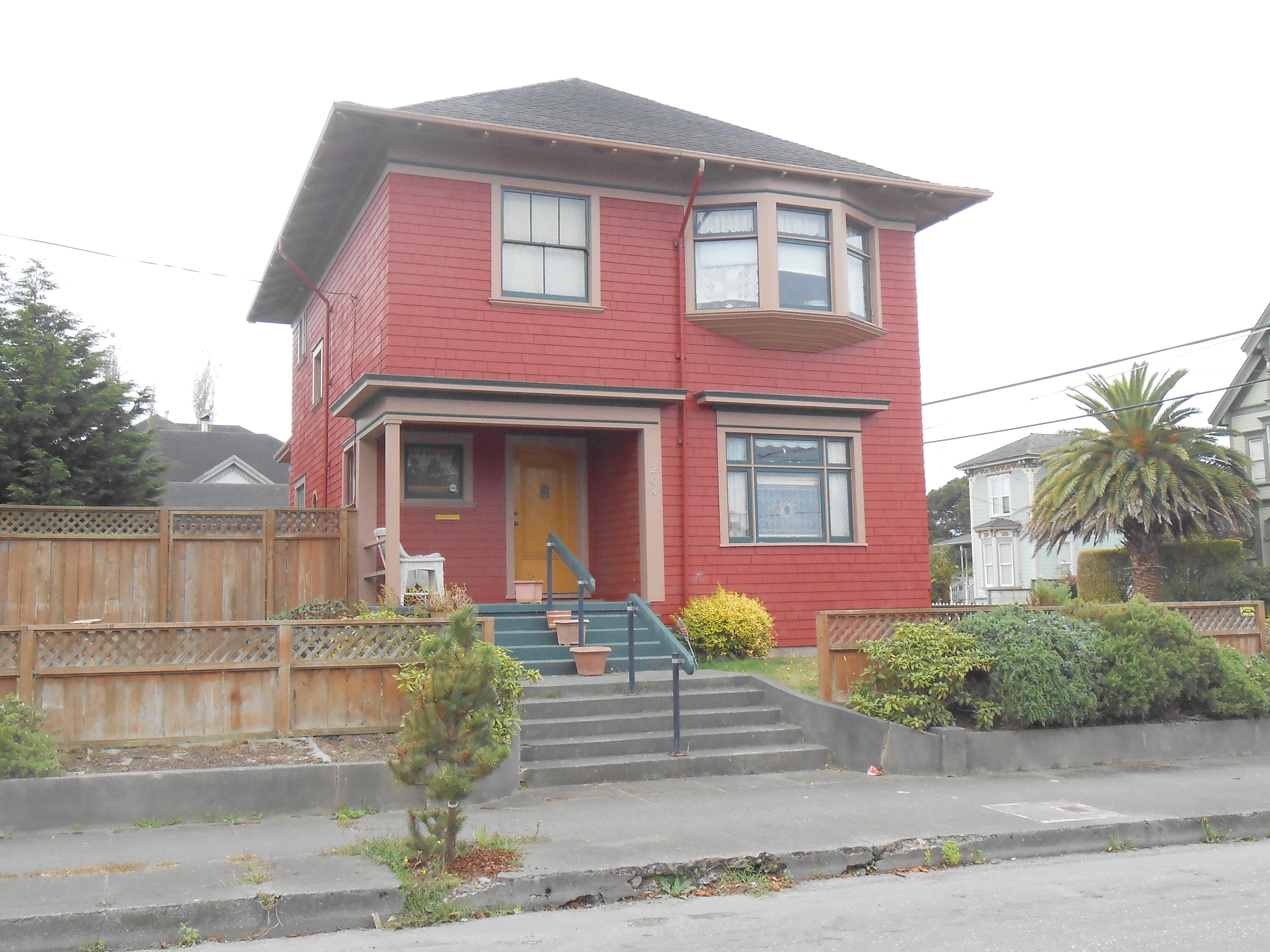 Built 1904. This shingled two-story transitional house boasts includes a hipped roof, recessed porch, and single second story bay window.