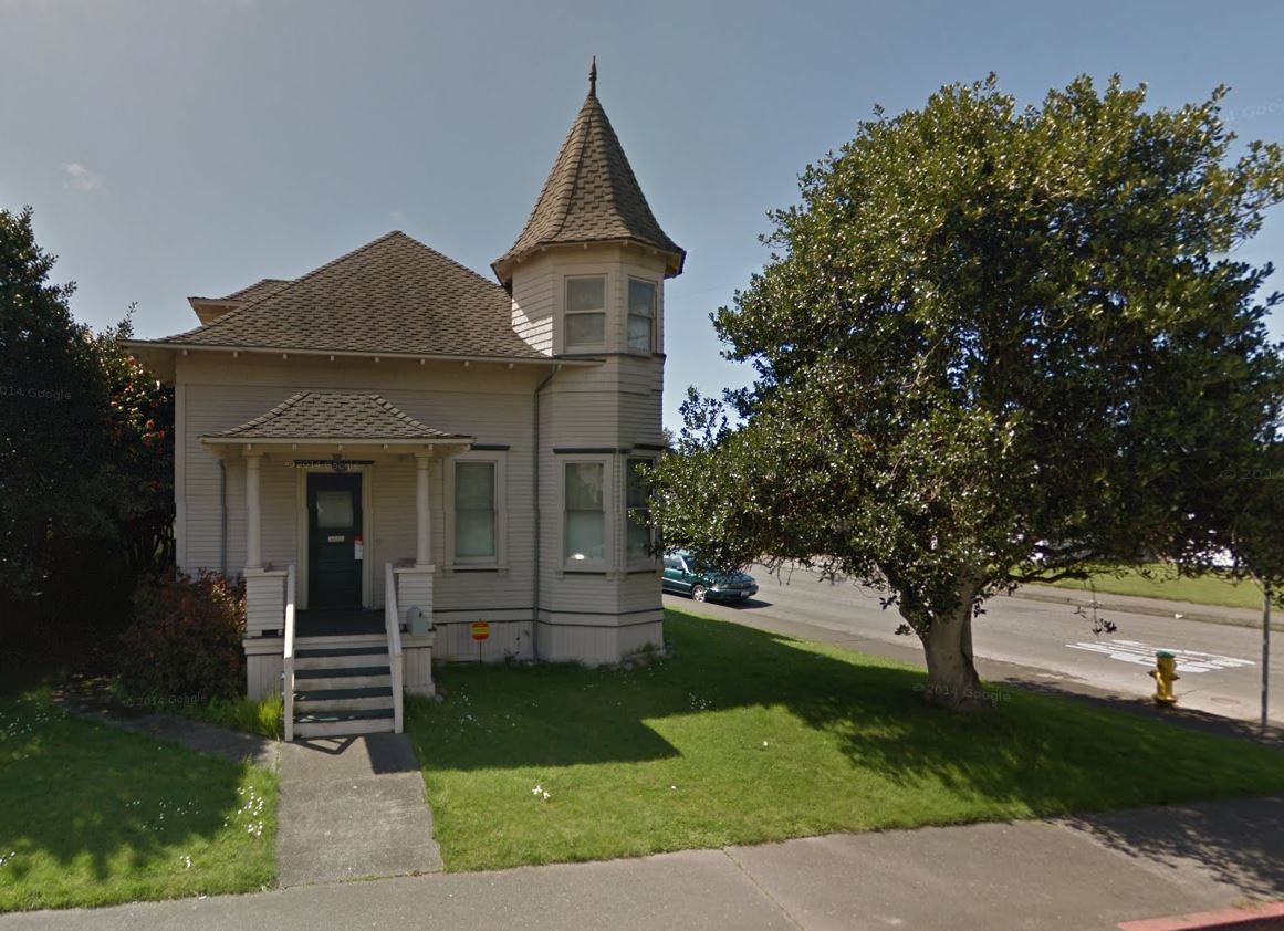 Built in 1904, this historic one-story frame house boasts an eye catching polygonal corner tower and has a hipped roof as well as an entry portico with bracketed flared eaves. The home was built and originally owned by F. Van Zandt and J. Palmer. Source: Eureka, An Architectural View