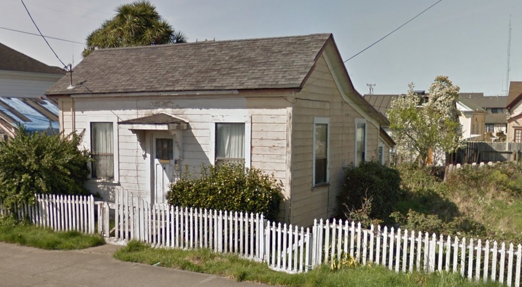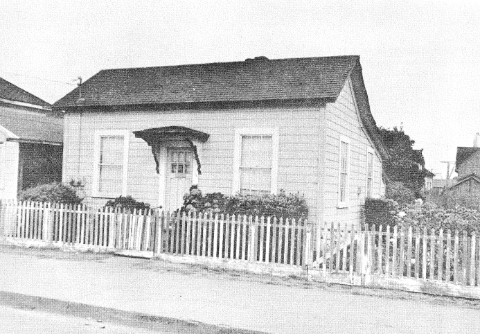 Built in 1914. This home is a miniature cottage with a large scale clapboard and 12 small panned windows that flank a bracketed entry canopy. Several additions have been made to the shed-like structure in the rear.