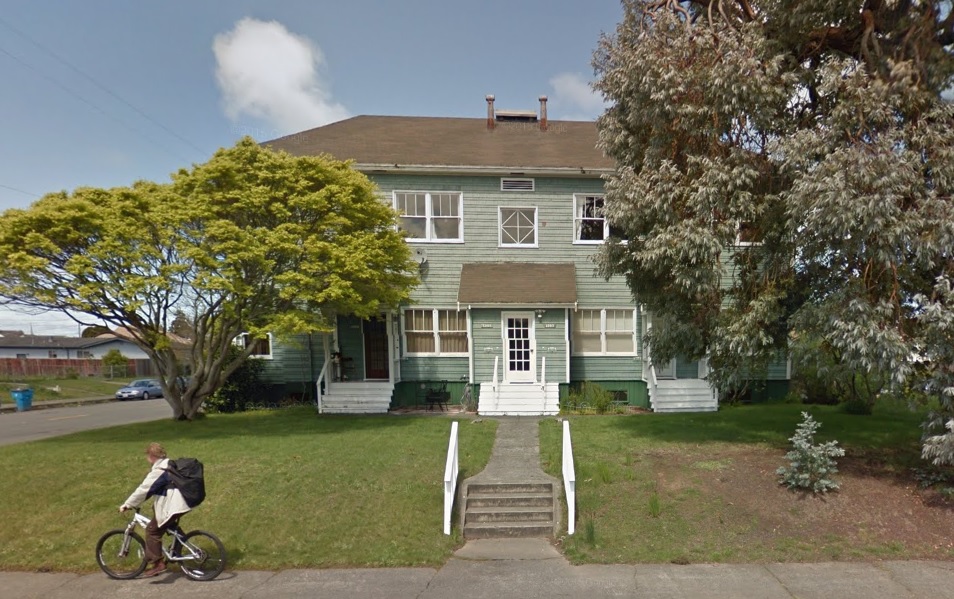 Circa 1935, this is a two-story shingled Colonial Revival triplex.