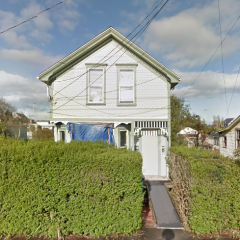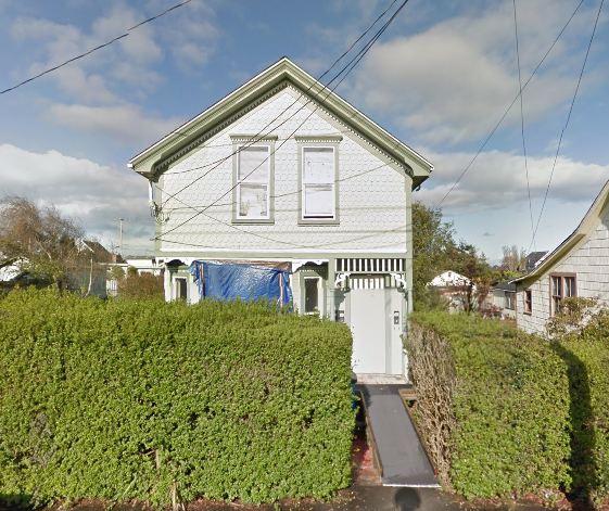 Built in 1900, this two-story shingle and frame house has a gabled roof and a slanted bay and porch.