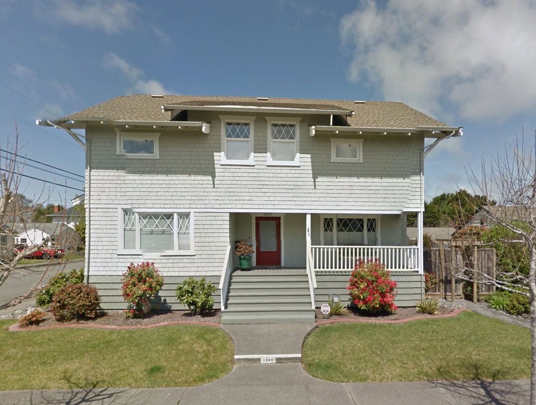 Built 1913. A two-story shingled Craftsman house with possible alterations to the second-floor exterior.