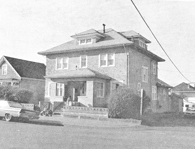 Built 1912. A large square 3-story shingled house with four dormers. A porch of massive substance forms an entry shelter. Overall symmetrical feeling is not supported by window and door placement. A side wing of one story projects to the left.