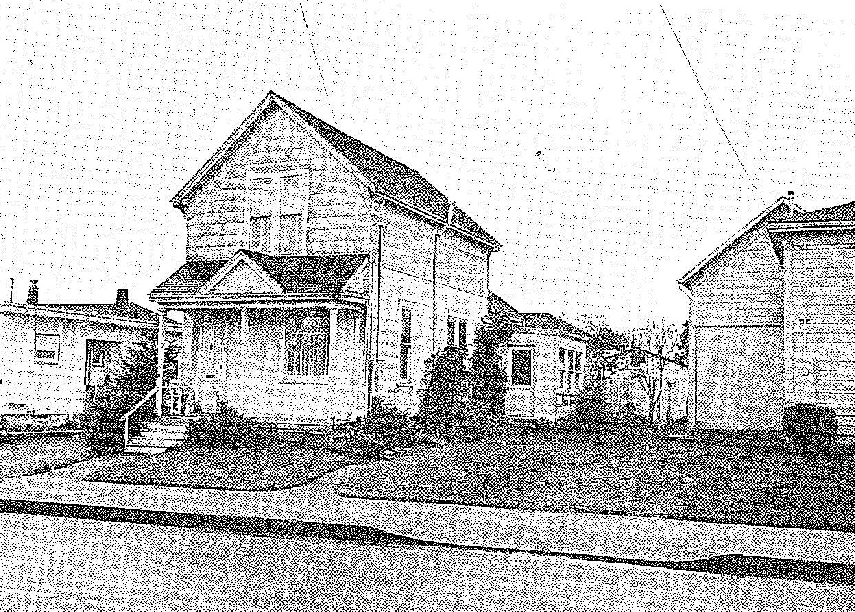 Built 1899. A tight salt-box form one-and-a-half stories high with a porch across the front. Door is to the left and a single faux-pedimental dormer pops up above the center porch post. Small remnants of former ornament remain at eaves, porch, etc. Several small additions have occurred at the rear and house has been coated in a two-tone pattern of pink and grey asbestos shingles.