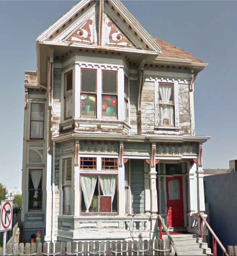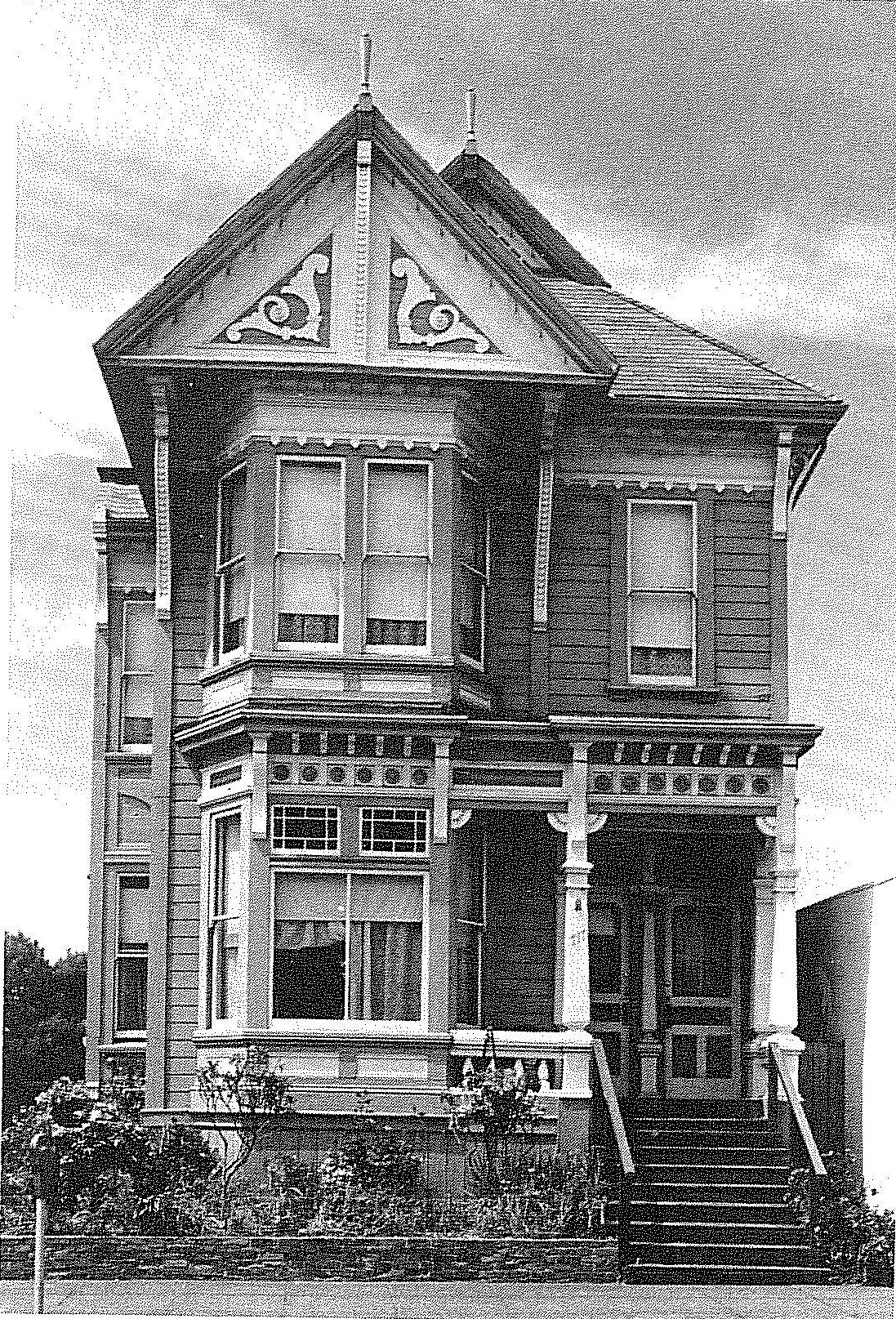 Built in 1895. This large-scale Eastlake detailing makes a strong visual statement on this two-story Queen Anne house. Most prominent on the front elevation is a massive pedimented gable end supported by large scroll brackets. The slanted bay beneath is of considerably smaller scale. Large columns support the porch, which is attached visually and physically to the slanted bays.