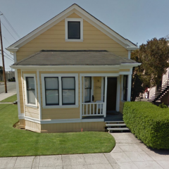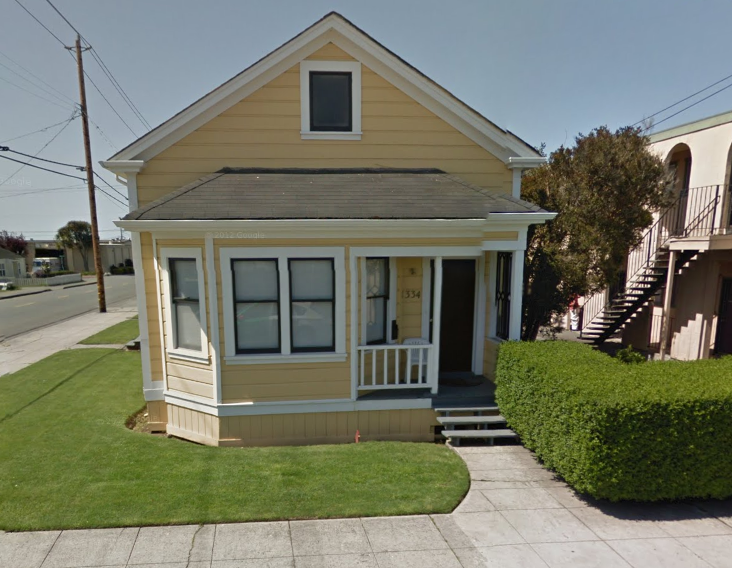 Originally owned by S. Weatherby and constructed in 1882, this home is a cottage style with a gabled roof, return cornice, and a slanted bay.