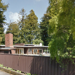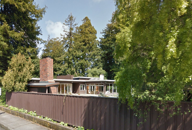 Built in 1950 by Allen Madsen, Edgar Lax, and Roger Smith and designed by S. Burre and Ackerman the one-story craftsman home is inspired by skeletal frame eaves. Although the street view is slightly obscure, there is a clear emphasis on low-laying roofs, and horizontal lines. There is also a notable chimney to the left side of the street view.