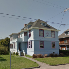 Originally owned by C. Hine and built in 1902, this two-story framed house is ornamented with shingled patterns and a hipped roof. Dormers are also present on the front and sides of the house and there is a diamond-paned window located on the front of the house. The original 1902 structure was modified circa 1910 to move the front entrance to the side and add the stacked sun rooms.