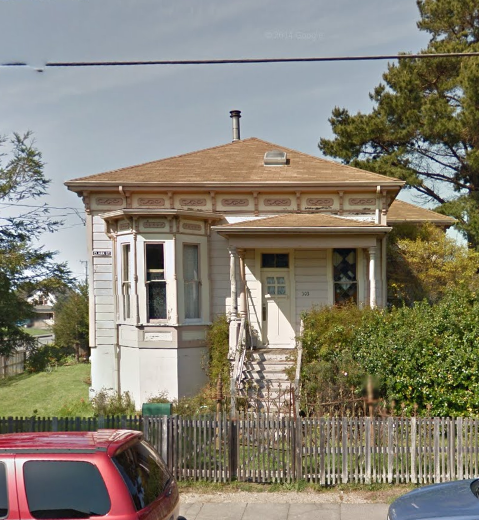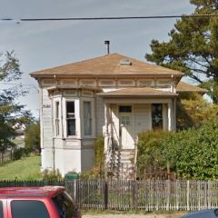 Originally owned by A. Chelstrand, this 1884 one-story frame cottage has a hipped roof, bracketed frieze, and slanted bays. The front porch and the front door are early 20th century alterations. The section of iron fence in the front yard is not original to this house. The iron fence came from the H.H. Buhne mansion that originally stood in the middle of the block between 7th and 8th streets and E and F streets.