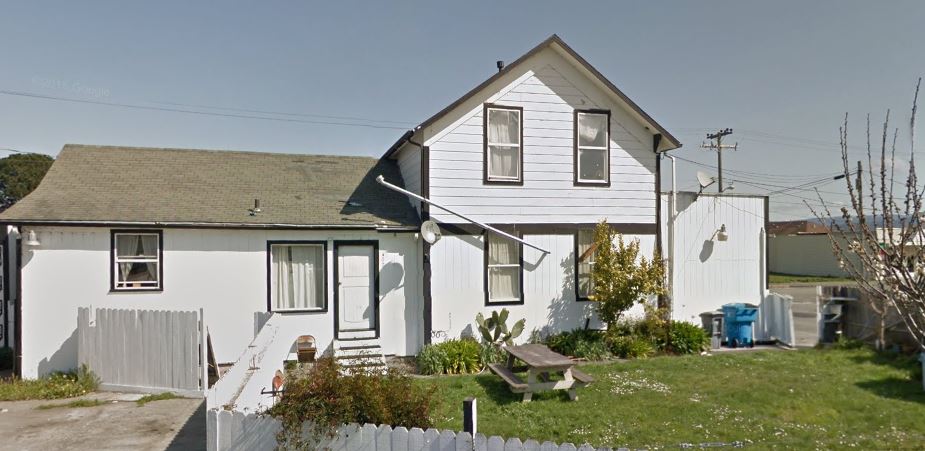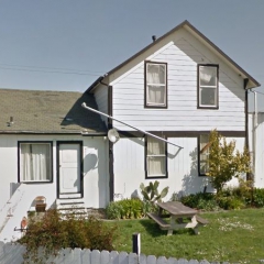 This is a two-story frame house, built in 1884, with a cross gable roof. Additions were added to the front for commercial use.