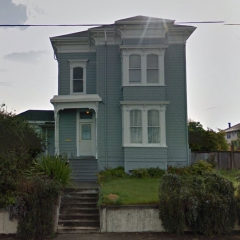 This home was built in 1887. It is a two-story frame Italianate house complete with a two-story square bay window and features a hipped roof, bracketed cornice, and sentimentally arched window. The property also has a rear addition. Source: Eureka, An Architectural View.